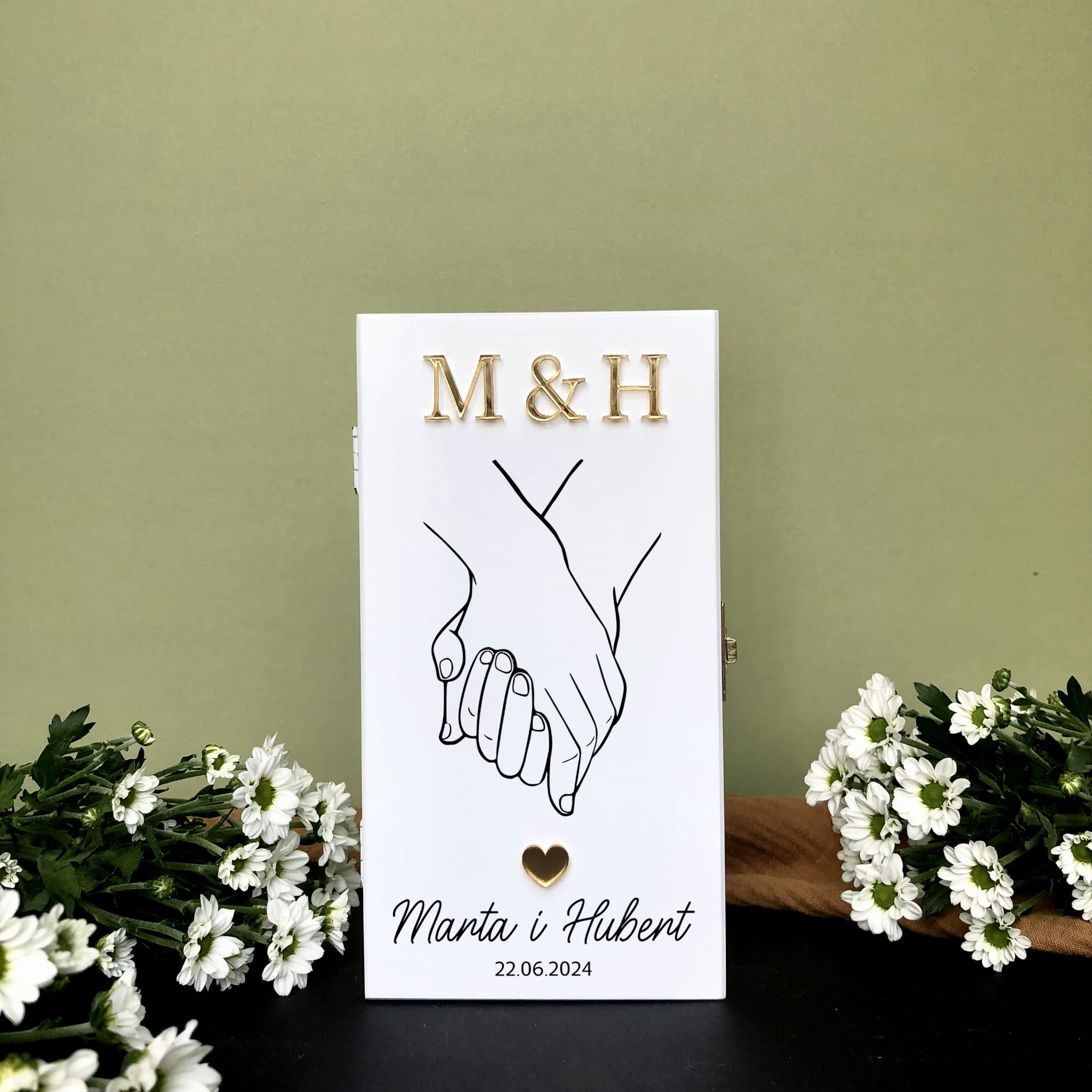 Pudełko od zewnątrz pomalowane jest na biały kolor. Na pudełku poza nadrukiem przyklejone są inicjały młodej pary i serduszko wykonane z plexi w kolorze złotego lustra.
