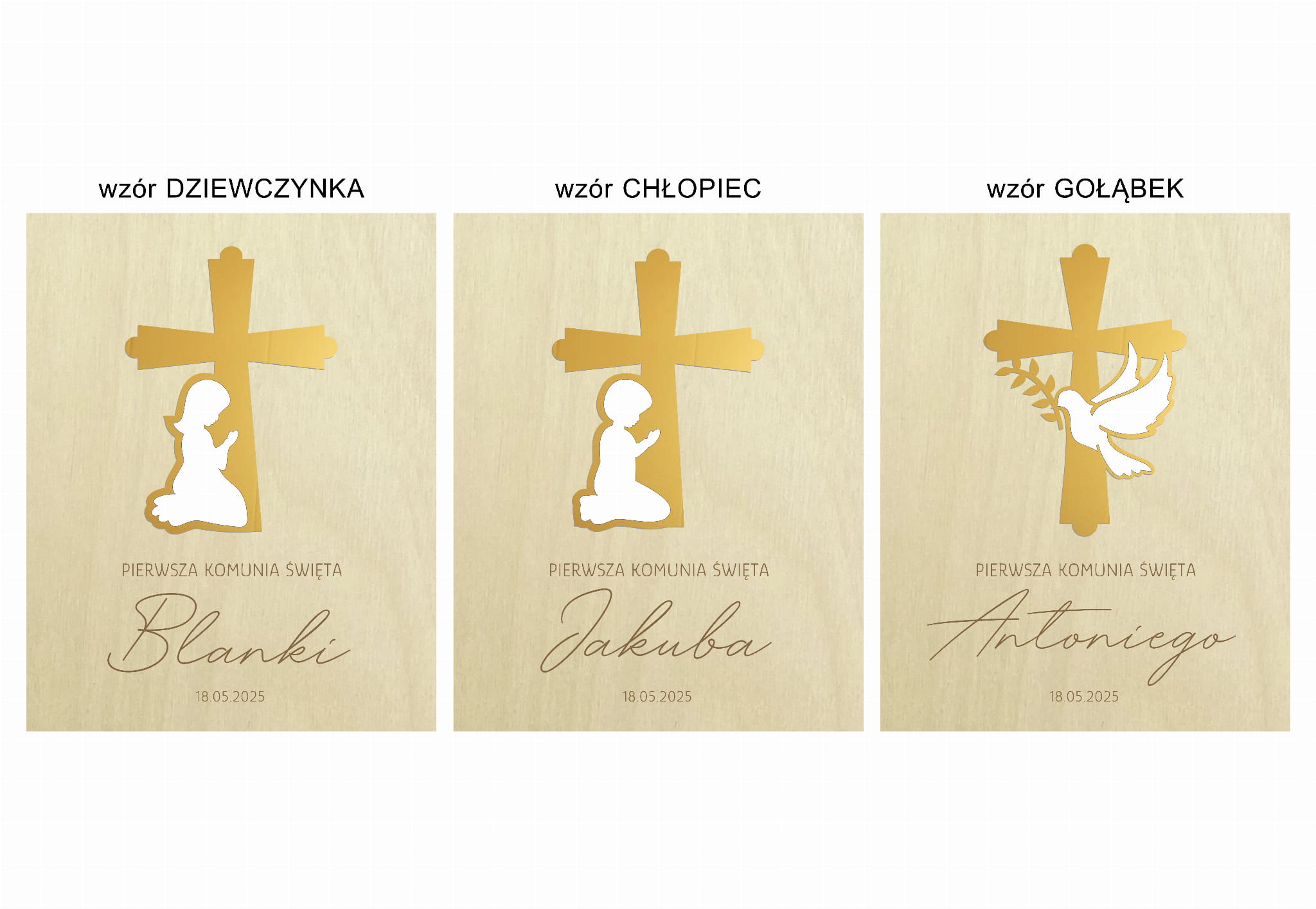 Na pudełku poza grawerem przyklejony jest wybrany krzyż wykonany z plexi w kolorze białym i złotego lustra.