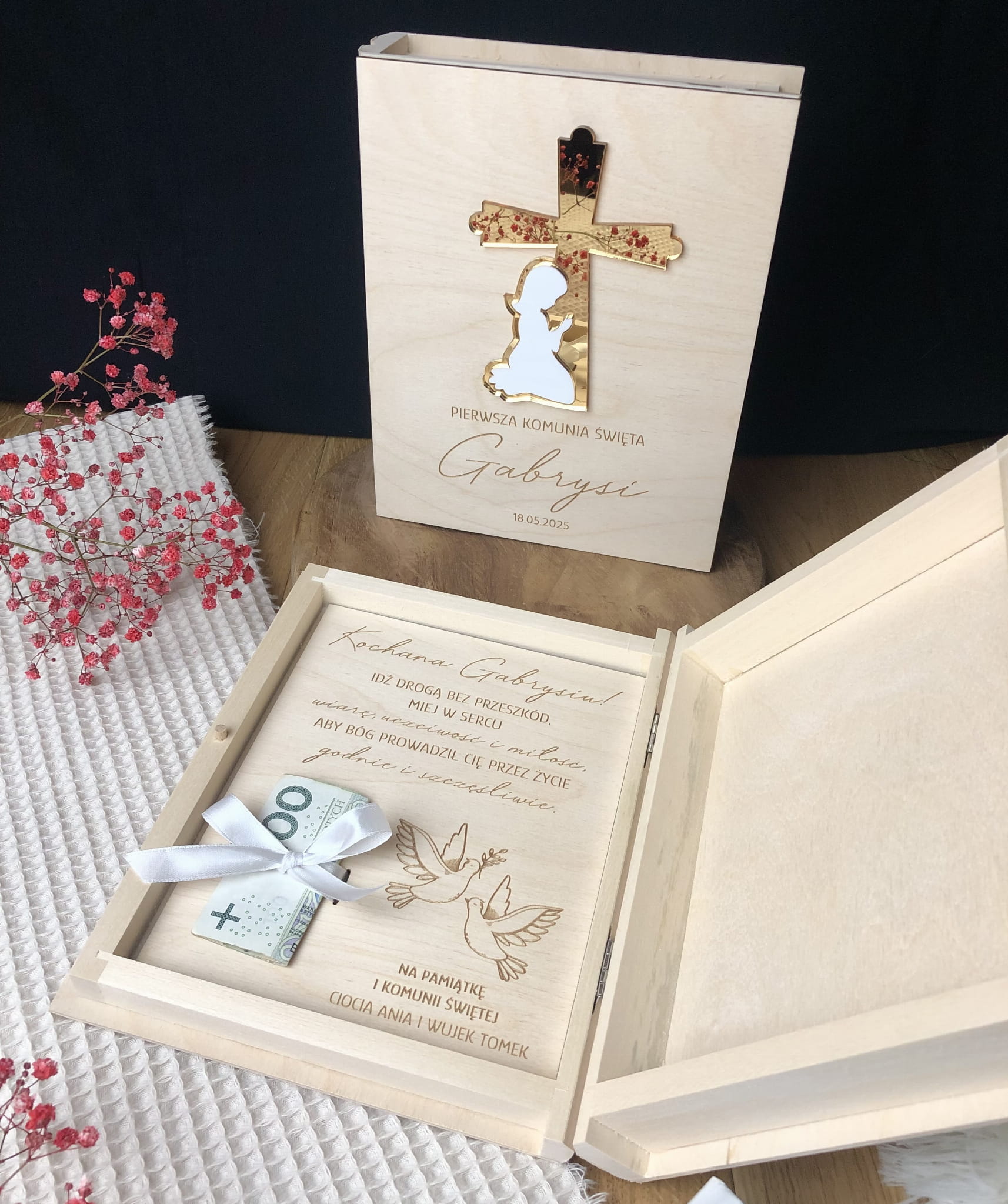 W środku pudełka wklejona jest tabliczka z wygrawerowanymi życzeniami i wstążka do przewiązania np. banknotów.