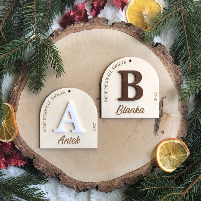 Drewniana bombka "Moje Pierwsze Święta" wykonana z wysokiej jakości sklejki brzozowej o grubości 3 mm.