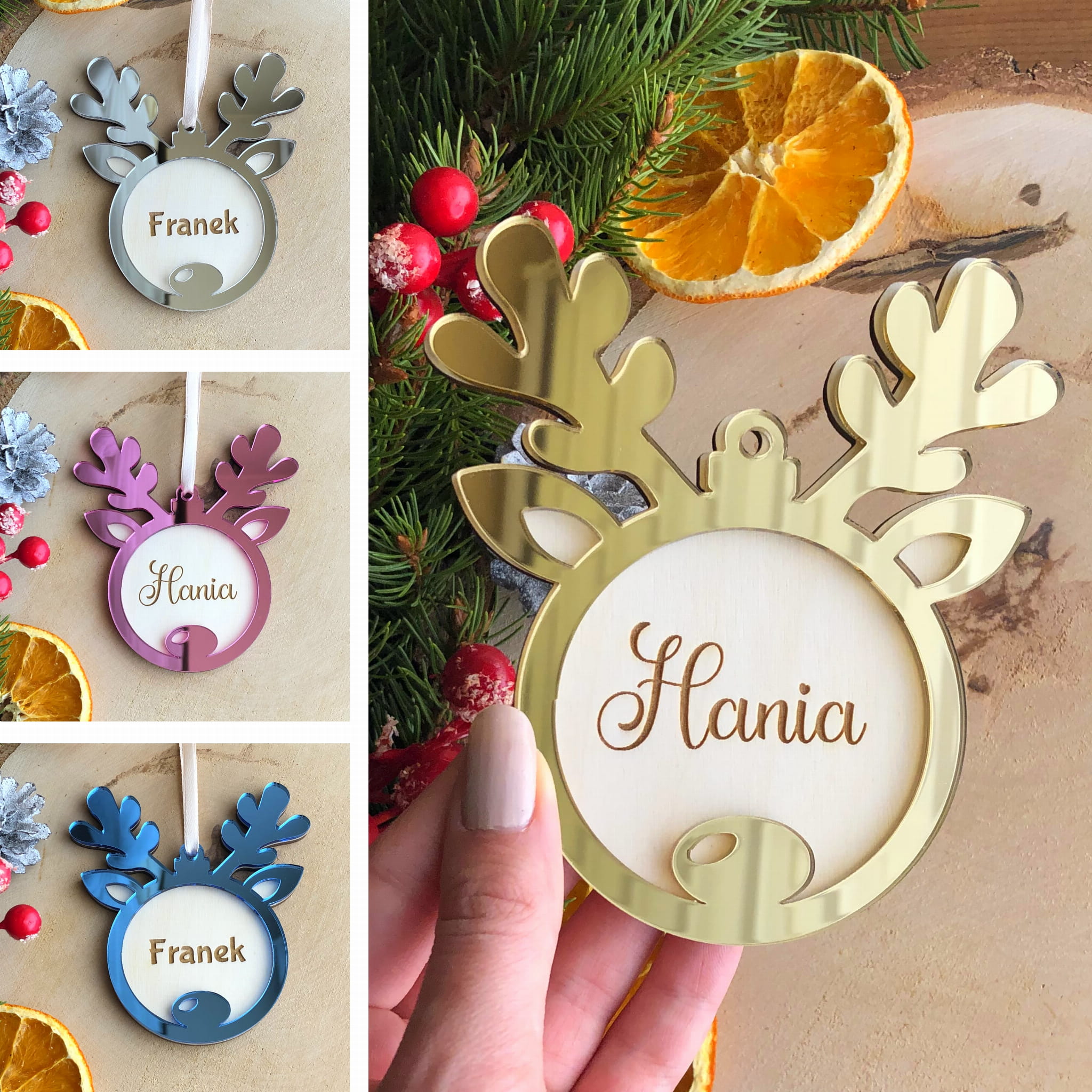 Drewniana bombka z ozdobną obręczą wykonaną z akrylu lustrzanego w wybranym kolorze.