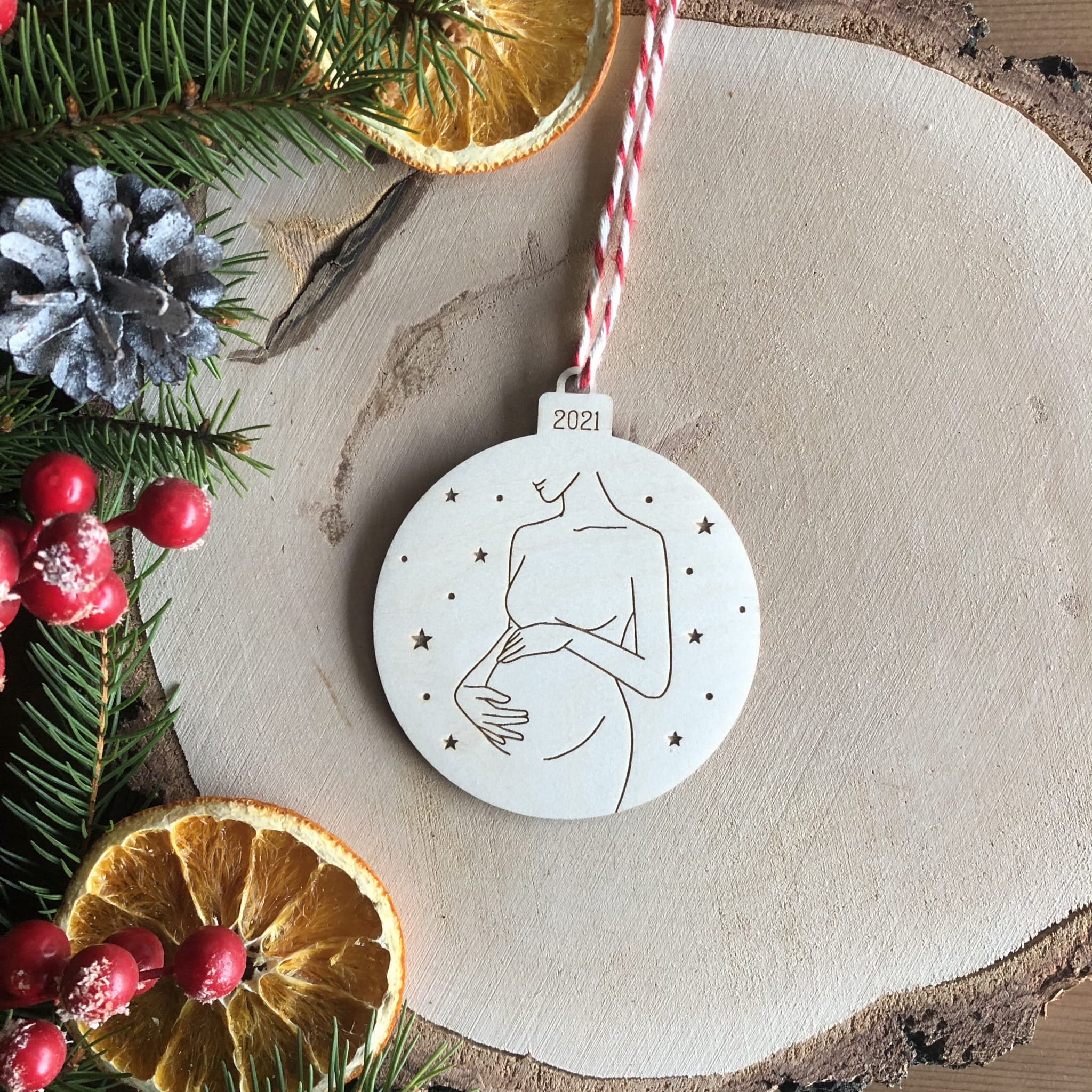 Drewniana bombka wykonana z wysokiej jakości sklejki brzozowej o grubości 3 mm.