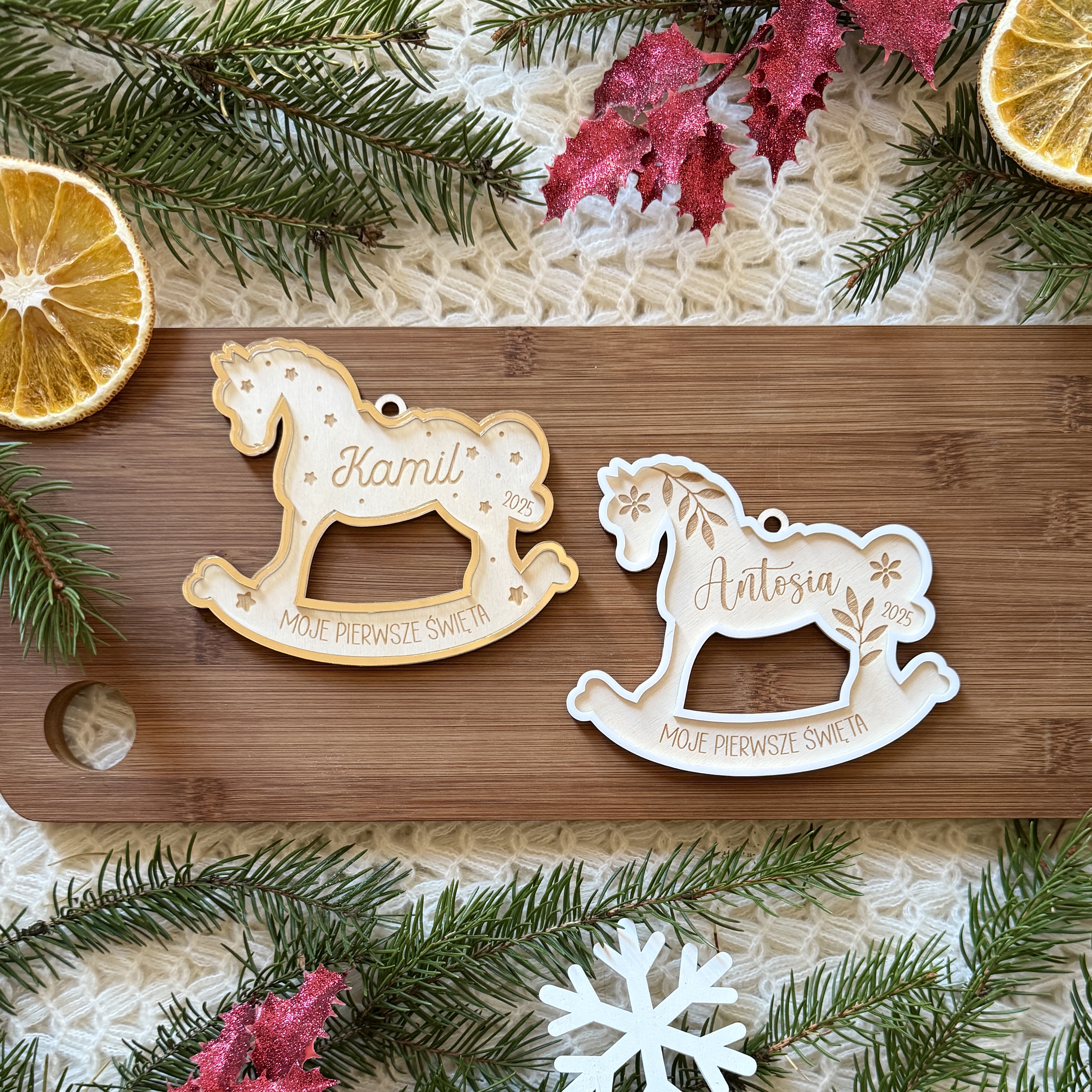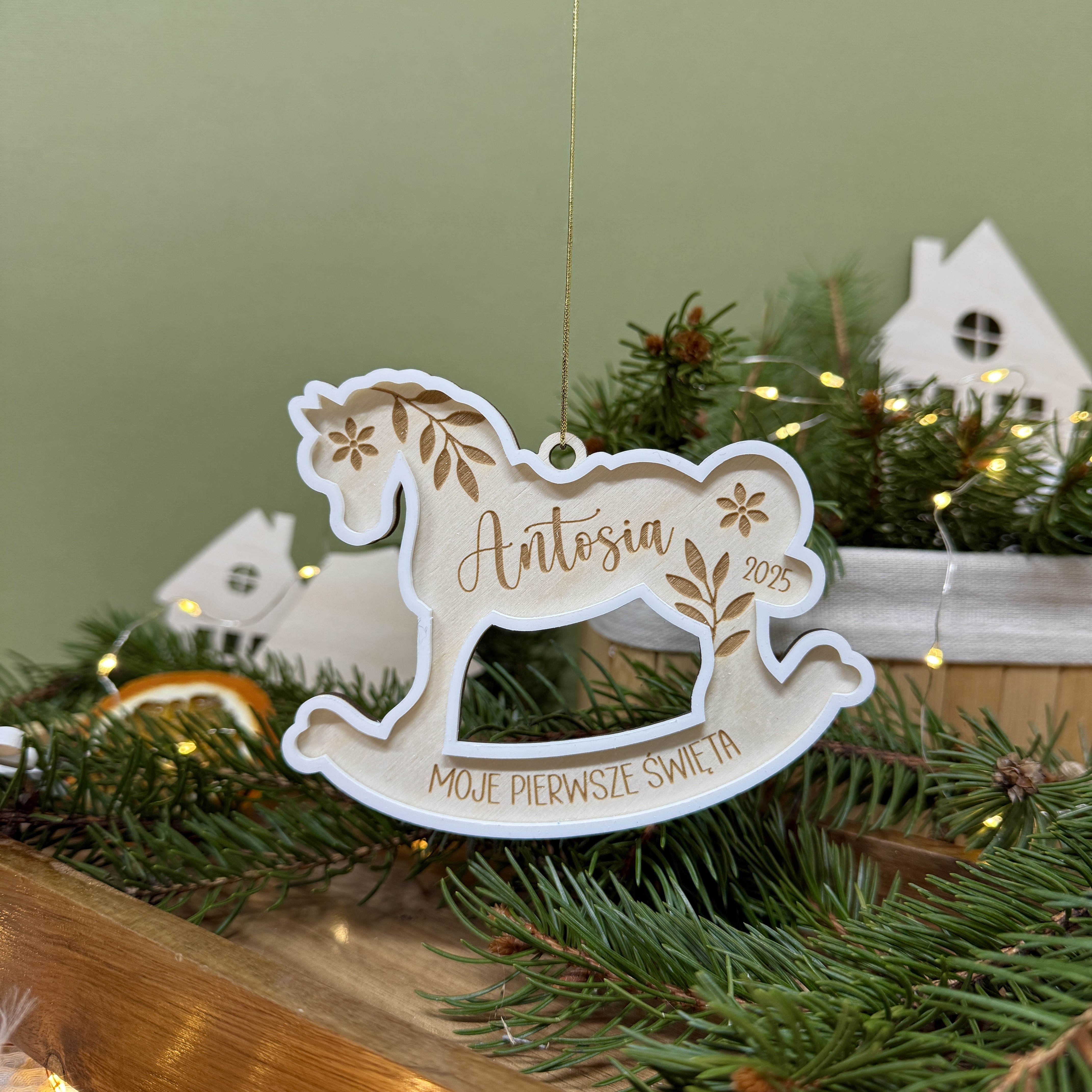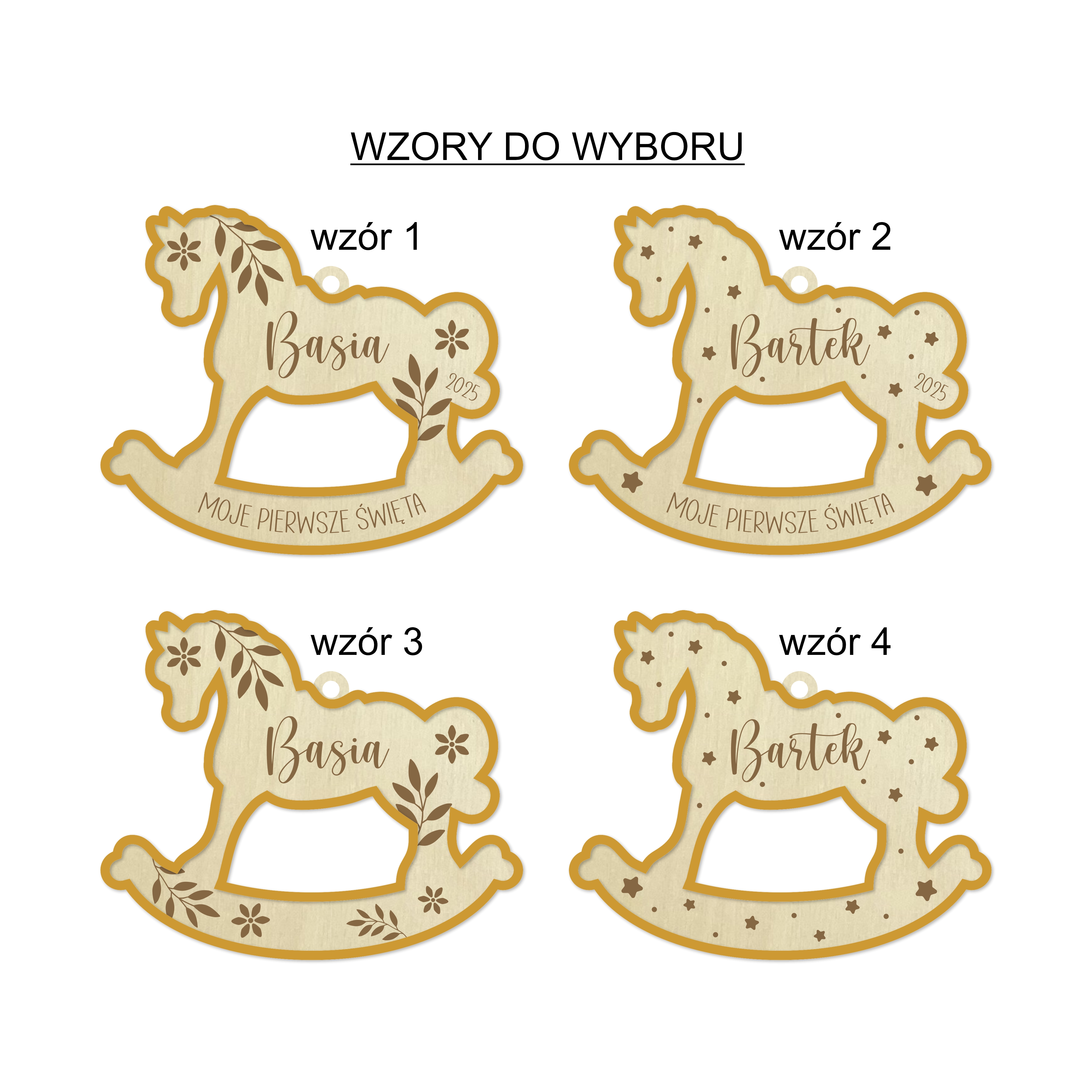 - wzór 1 - kwiatki, gałązki, imię i rok a na dole napis MOJE PIERWSZE ŚWIĘTA