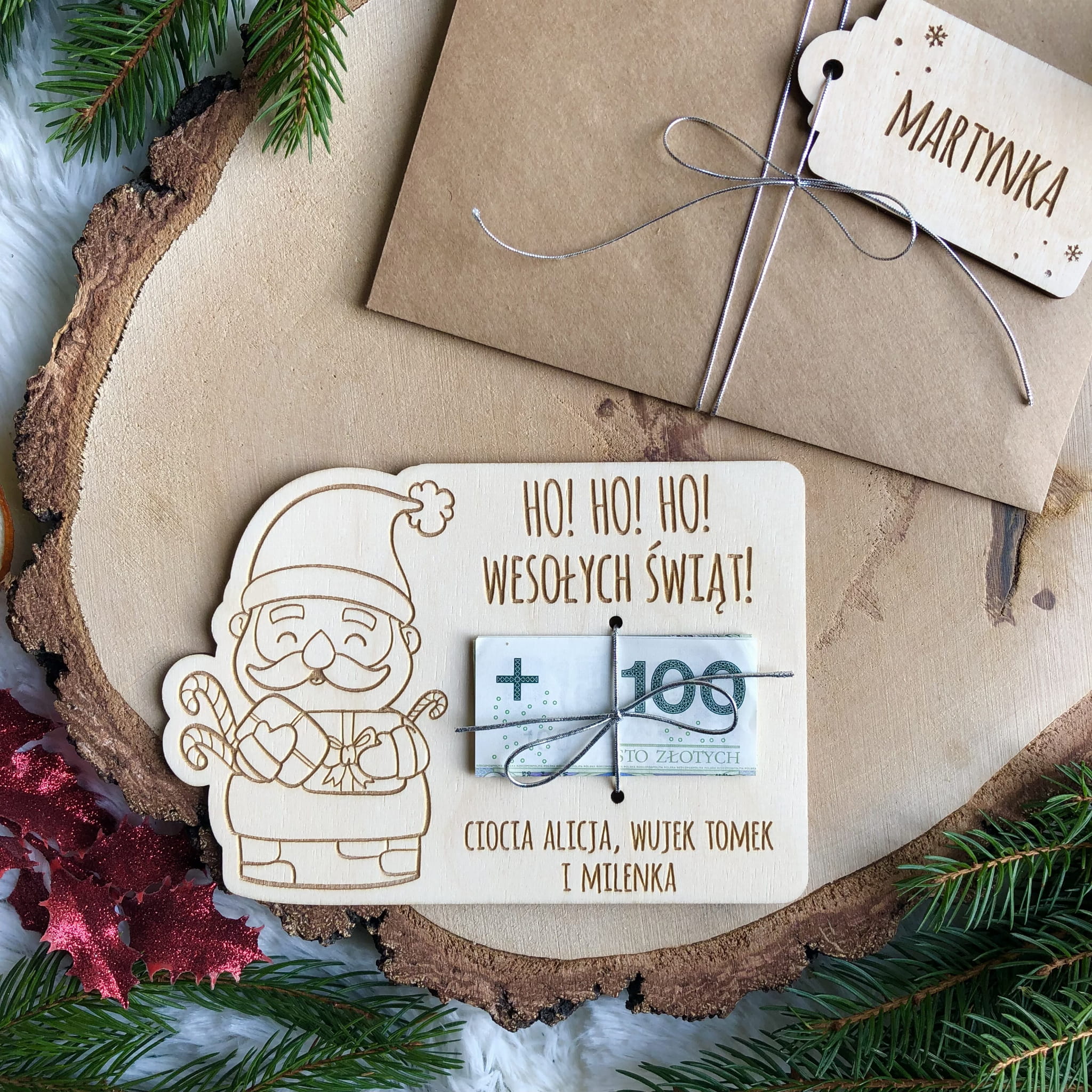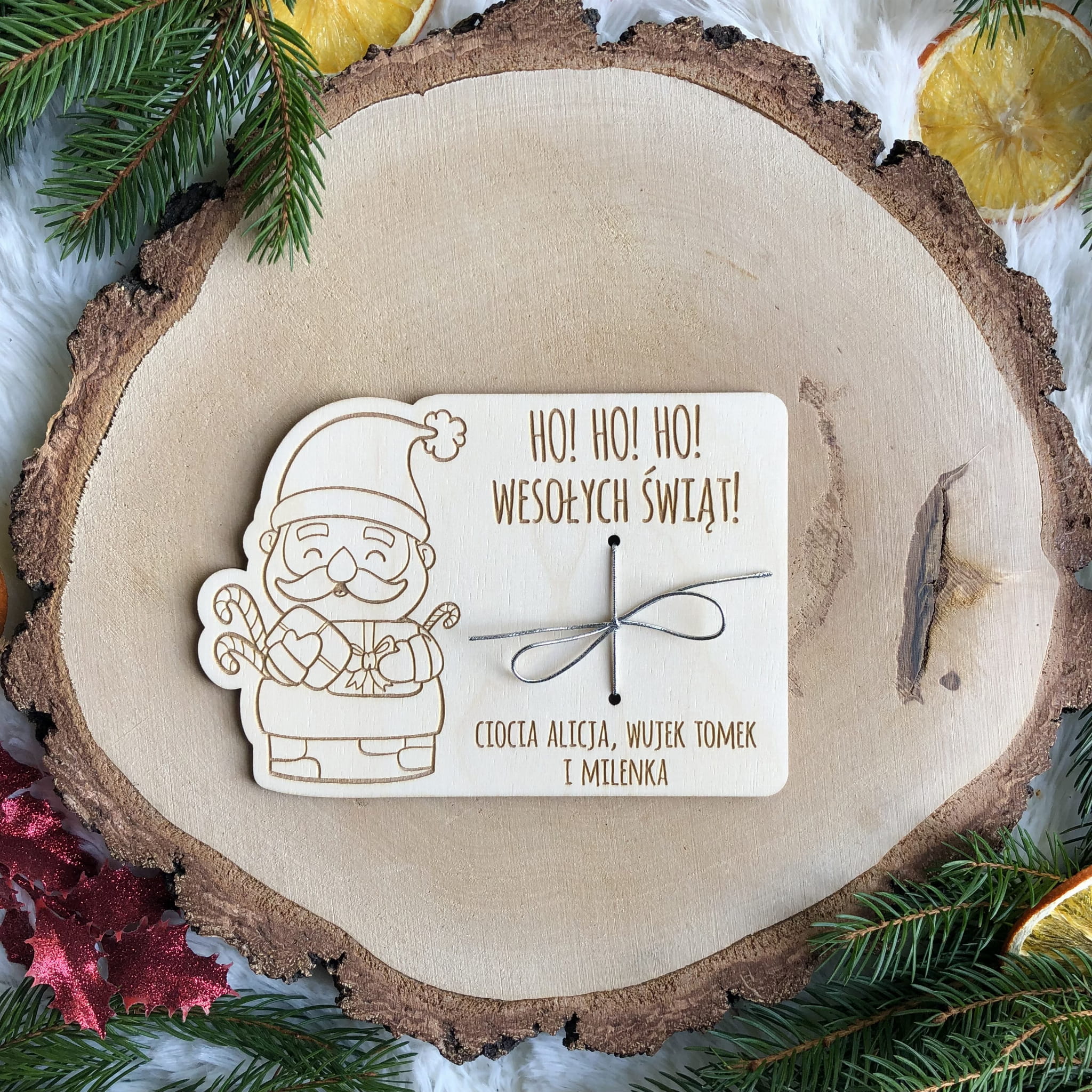Kartka w zestawie z eco kopertą i z zawieszką z imieniem osoby obdarowanej.