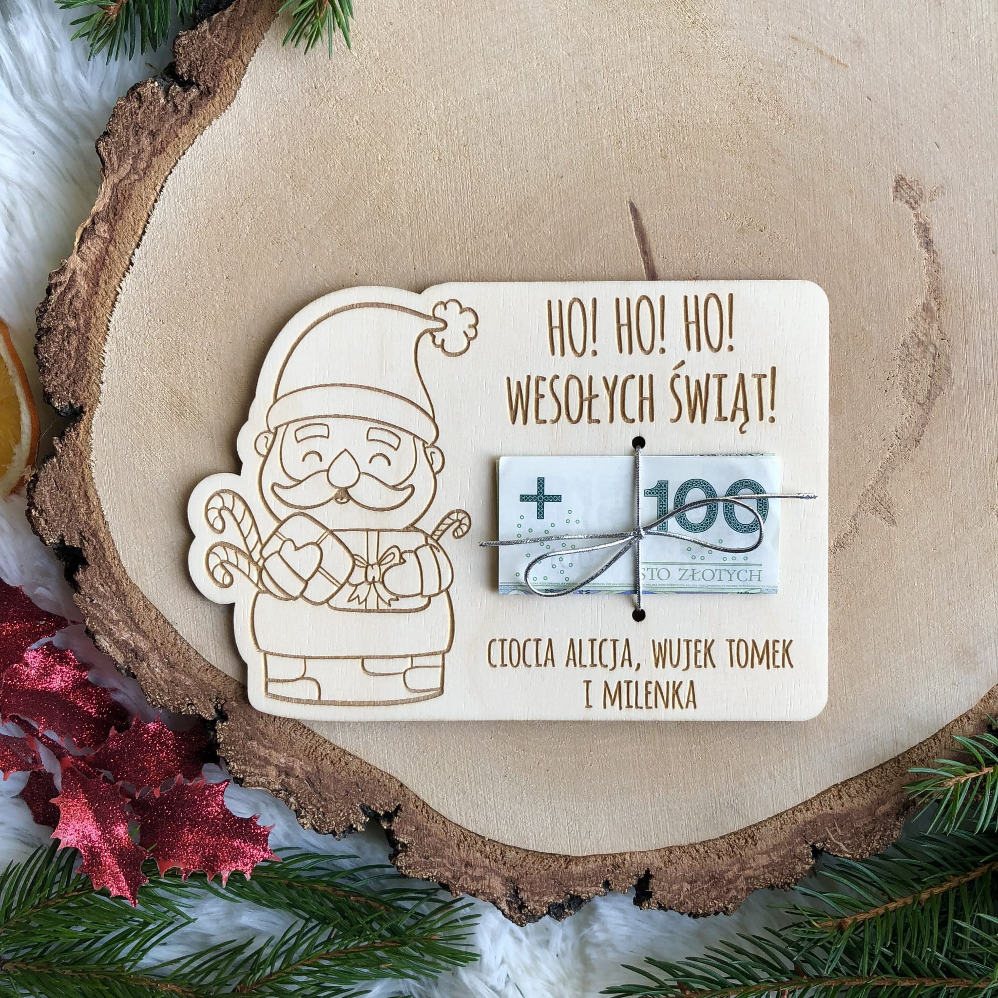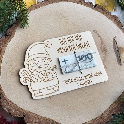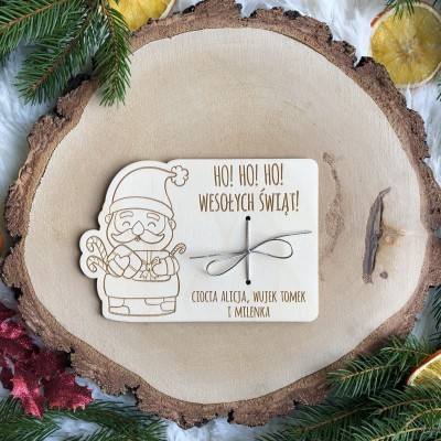 Oryginalny prezent w formie drewnianej kartki ze sznurkiem do przewiązania pieniędzy.