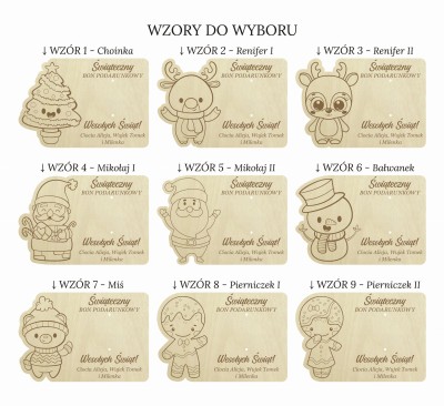 Wybierz wzór 1 - Choinka wzór 2 - Renifer I wzór 3 - Renifer II wzór 4 - Mikołaj I wzór 5 - Mikołaj II wzór 6 - Bałwanek wzór 7 - Miś wzór 8 - Pierniczek I wzór 9 - Pierniczek II