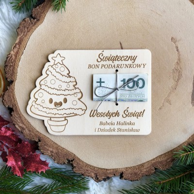 Oryginalny prezent w formie drewnianej kartki ze sznurkiem do przewiązania pieniędzy.