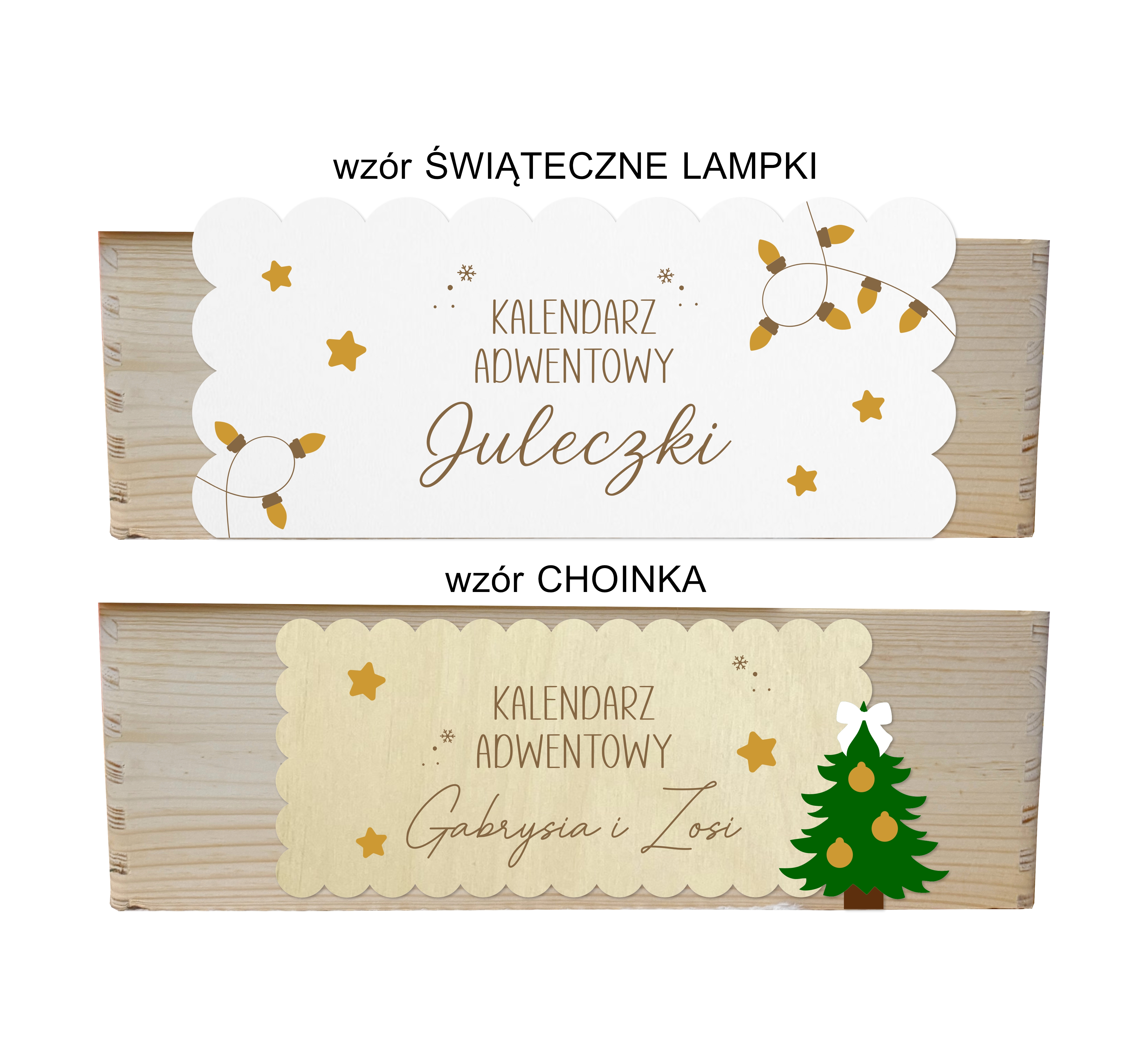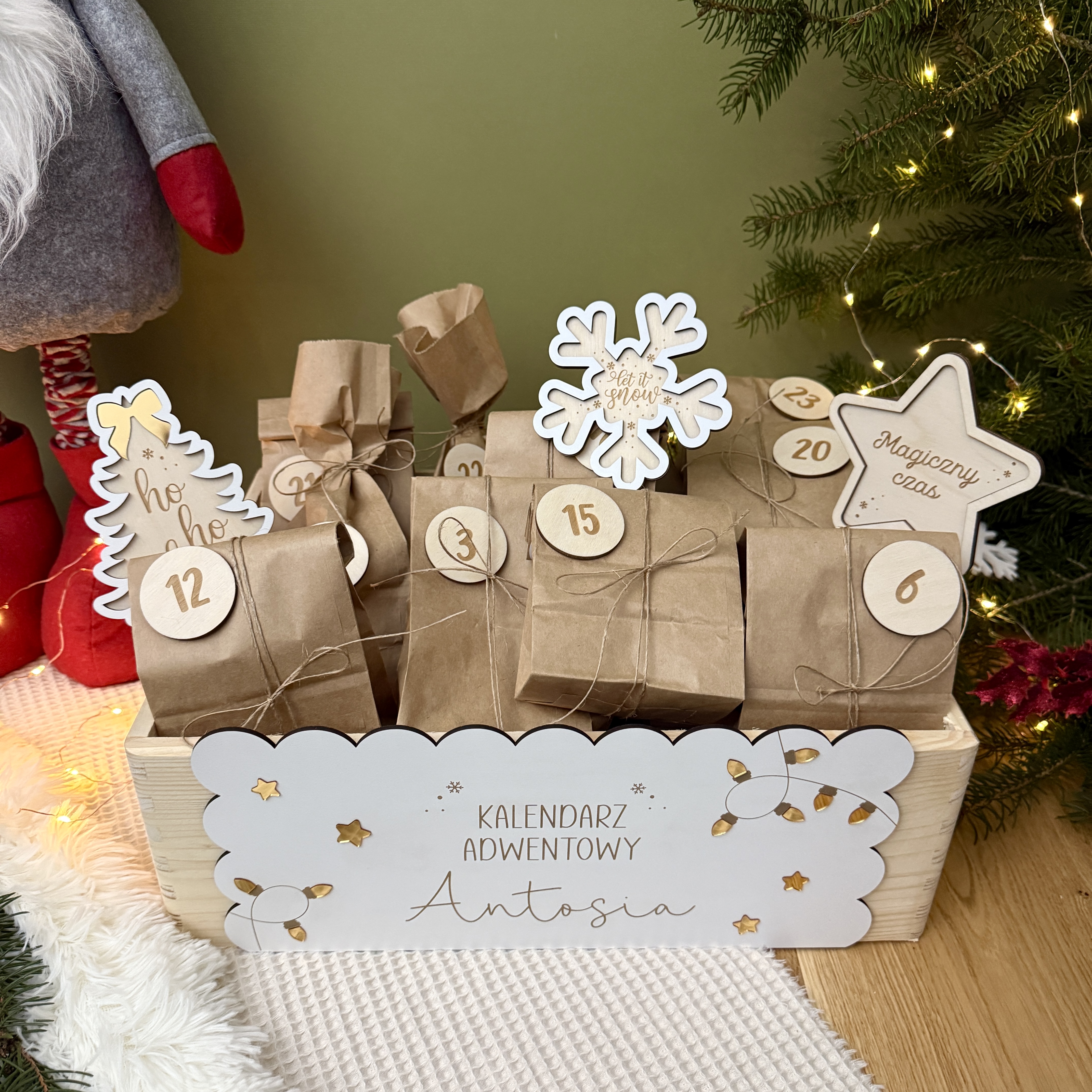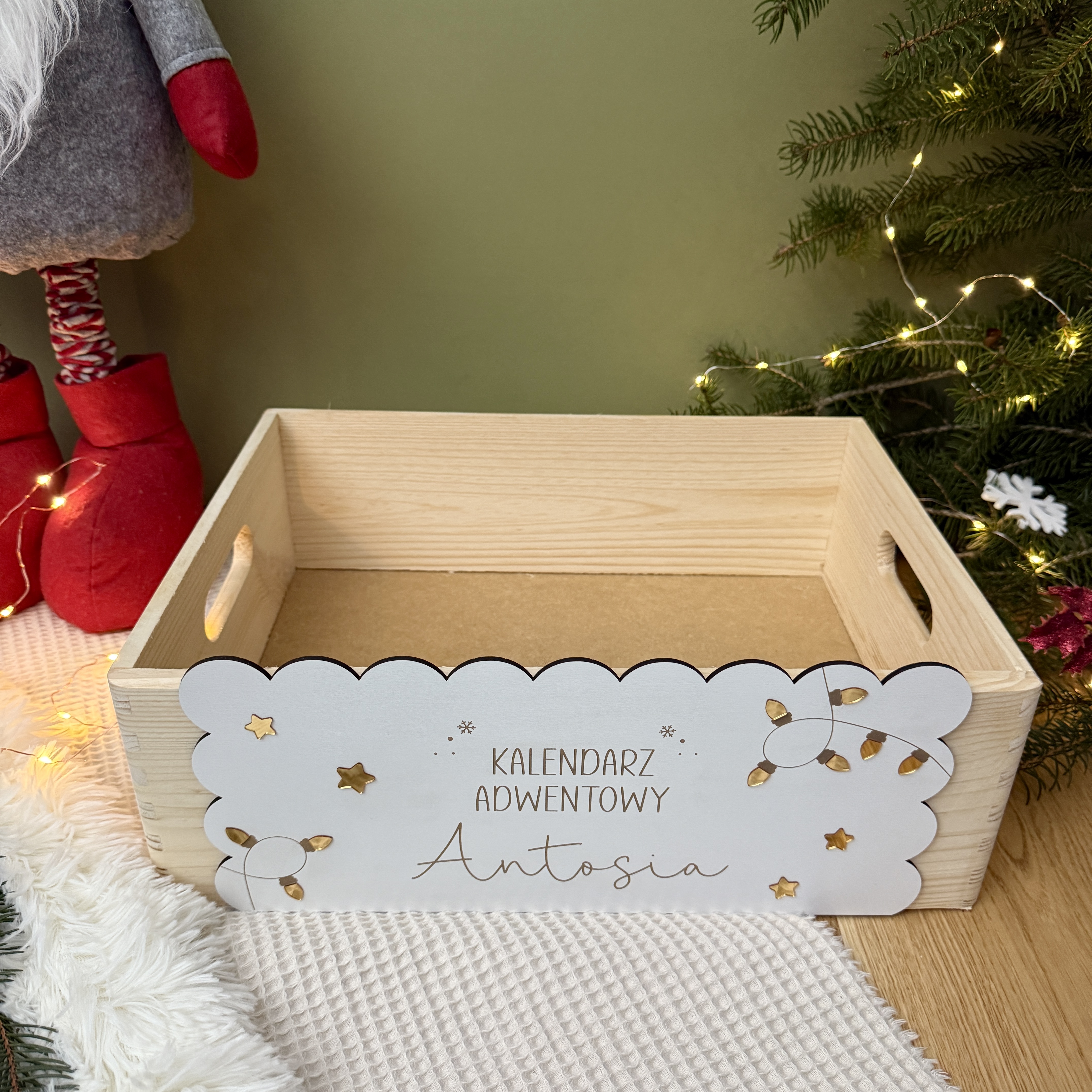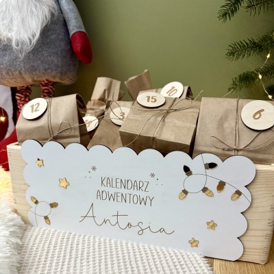 Wyjątkowy, personalizowany kalendarz adwentowy w pudełku do samodzielnego wypełnienia. Pudełko pomieści prezenciki w różnych rozmiarach.