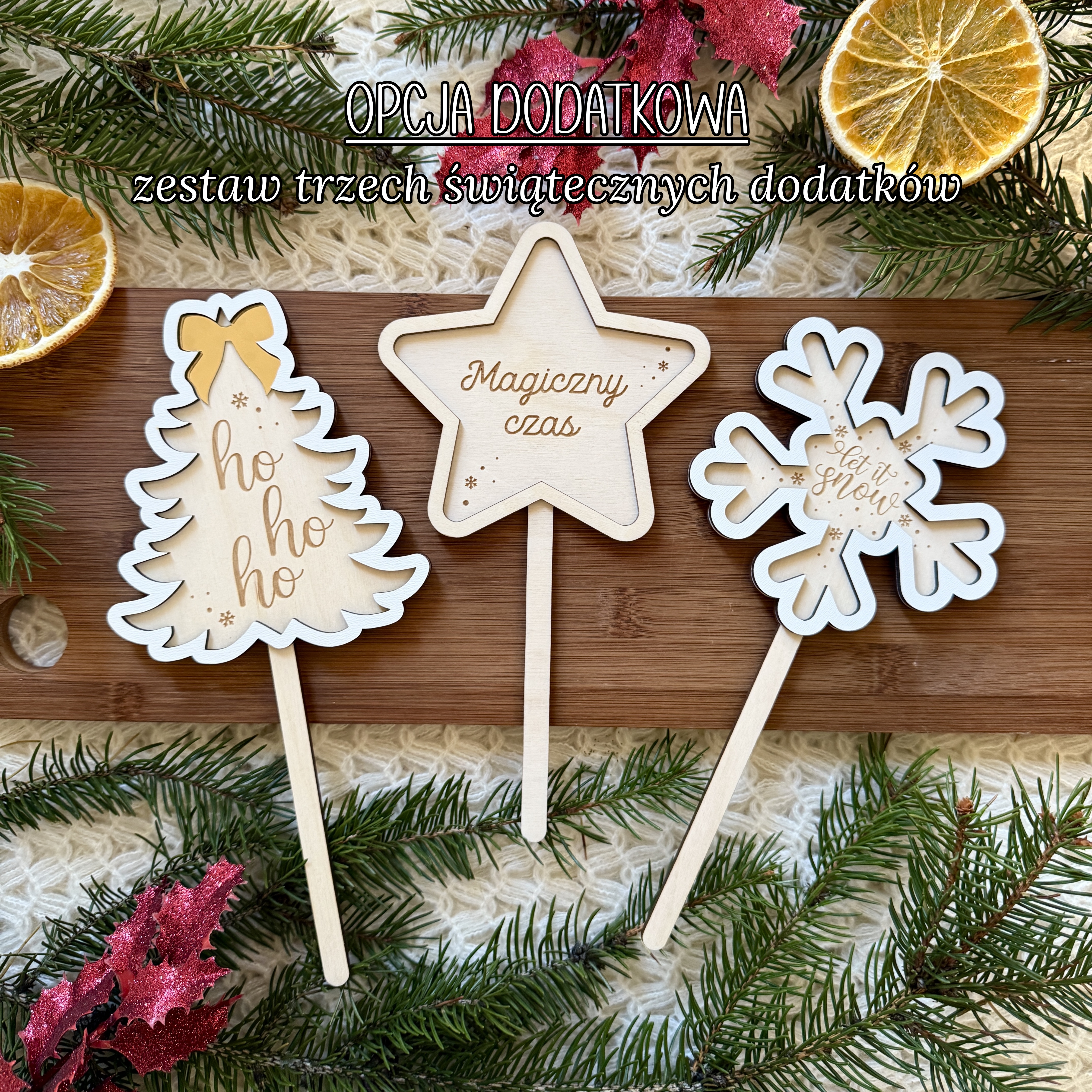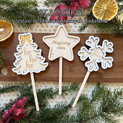 - Opcjonalnie: zestaw trzech świątecznych dodatków (choinka, gwiazdka i śnieżynka na patyczku)