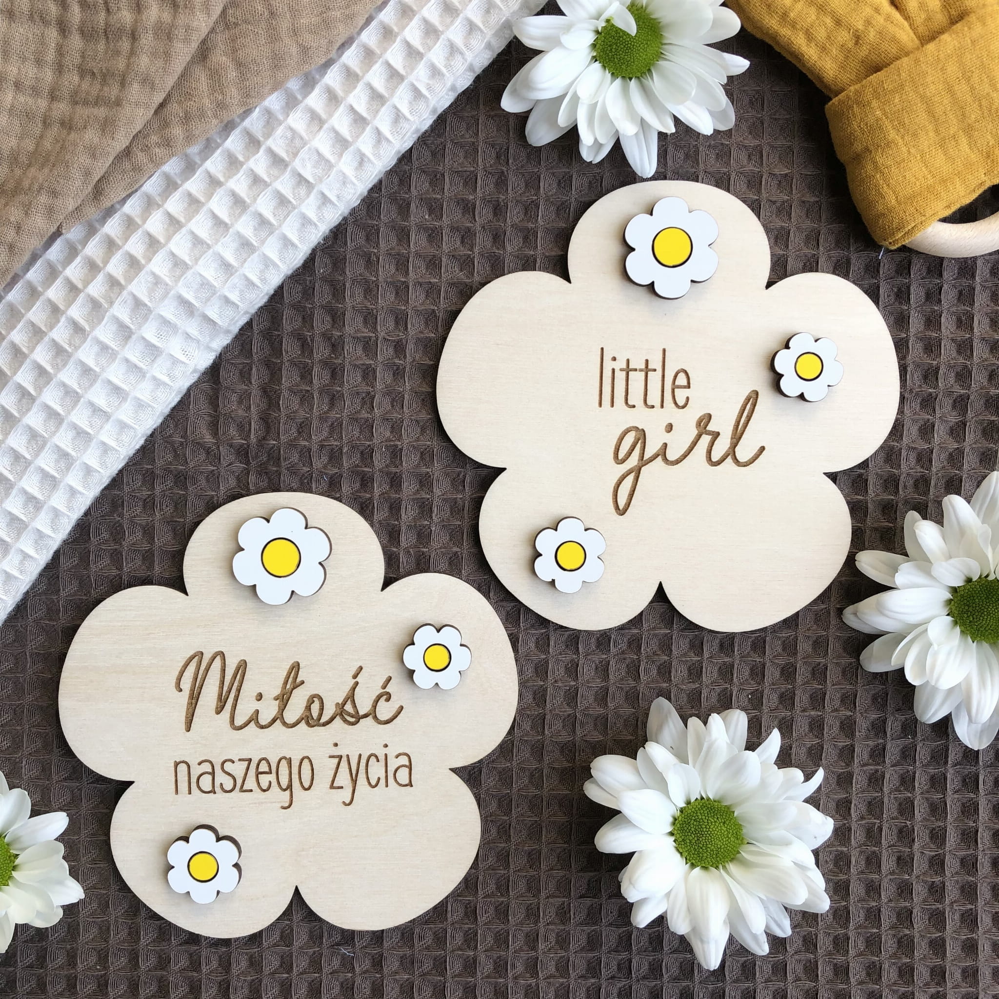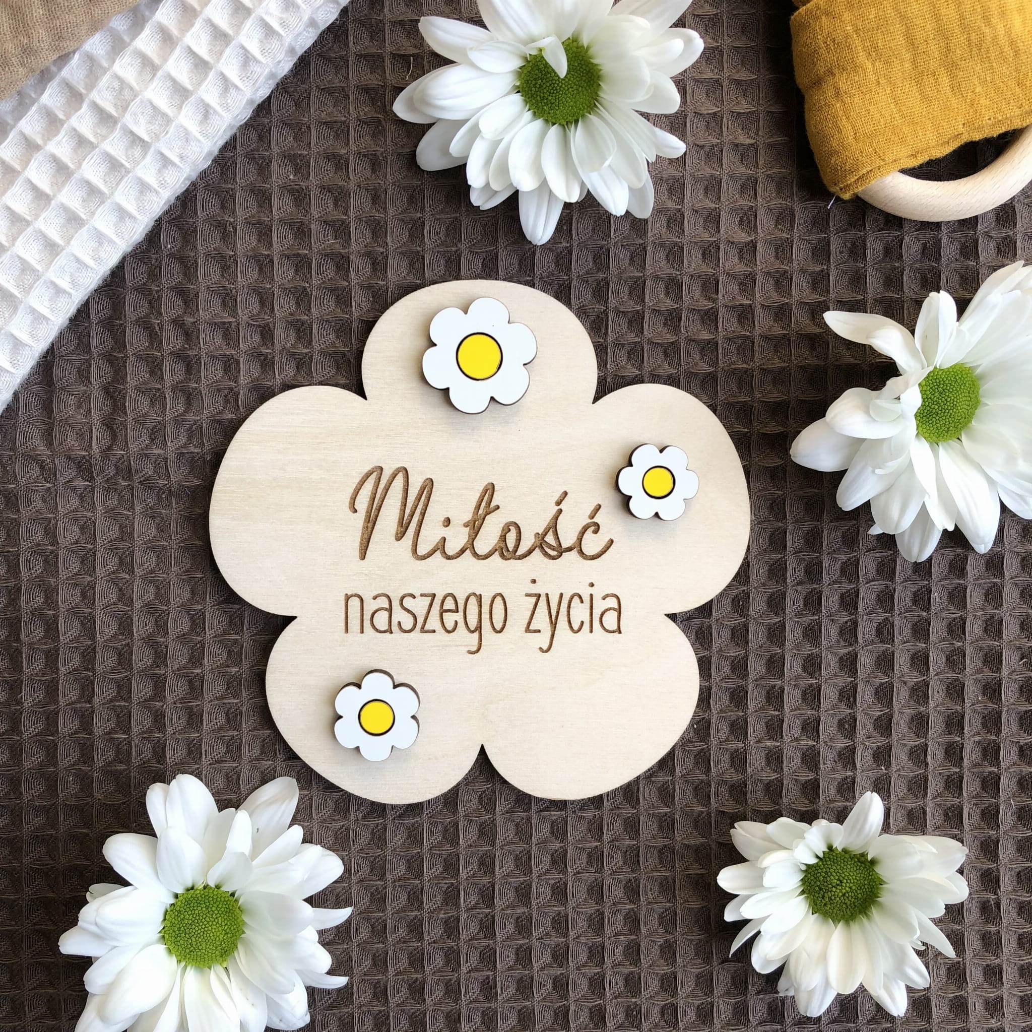 Stokrotki wykonane są ze sklejki brzozowej i błyszczącego papieru.