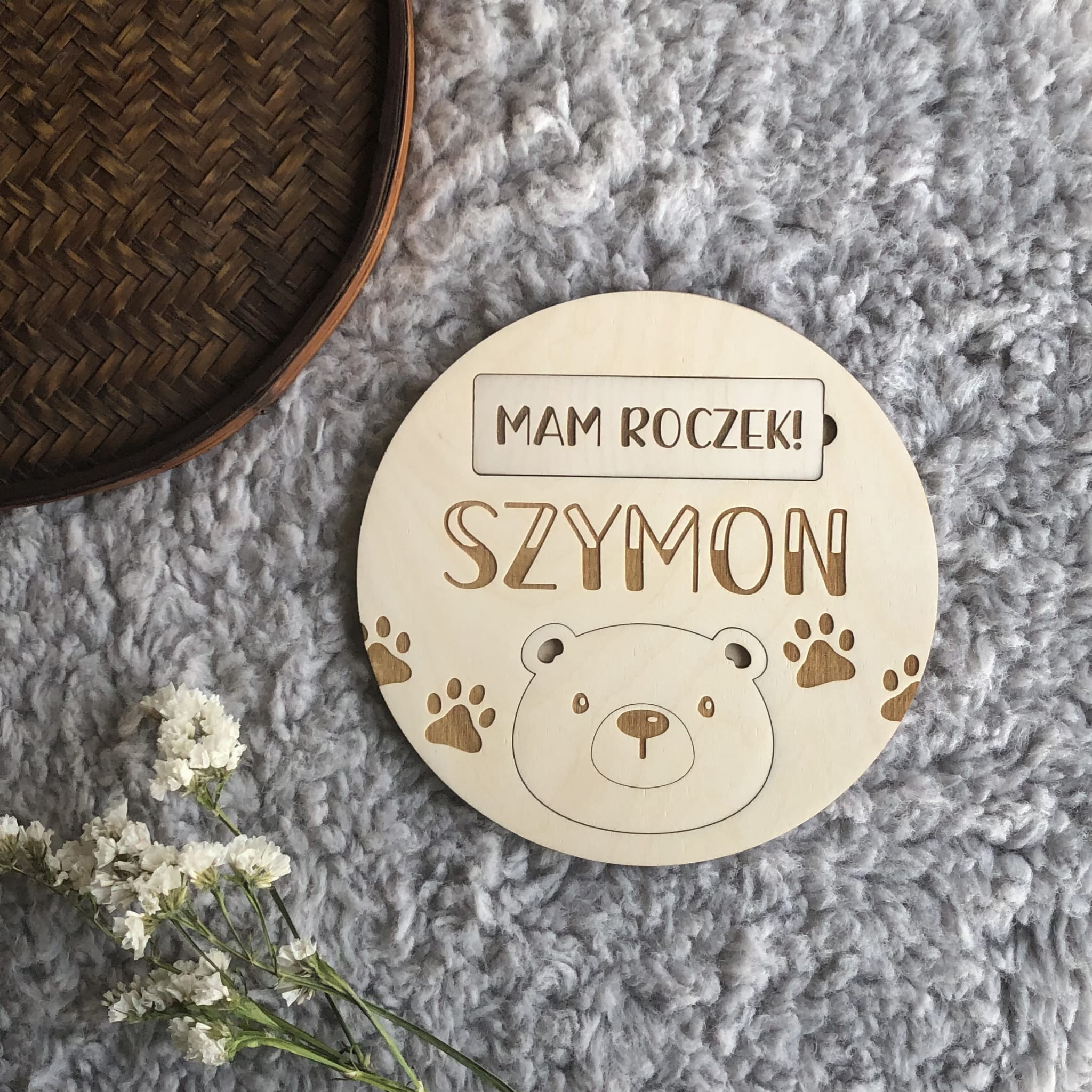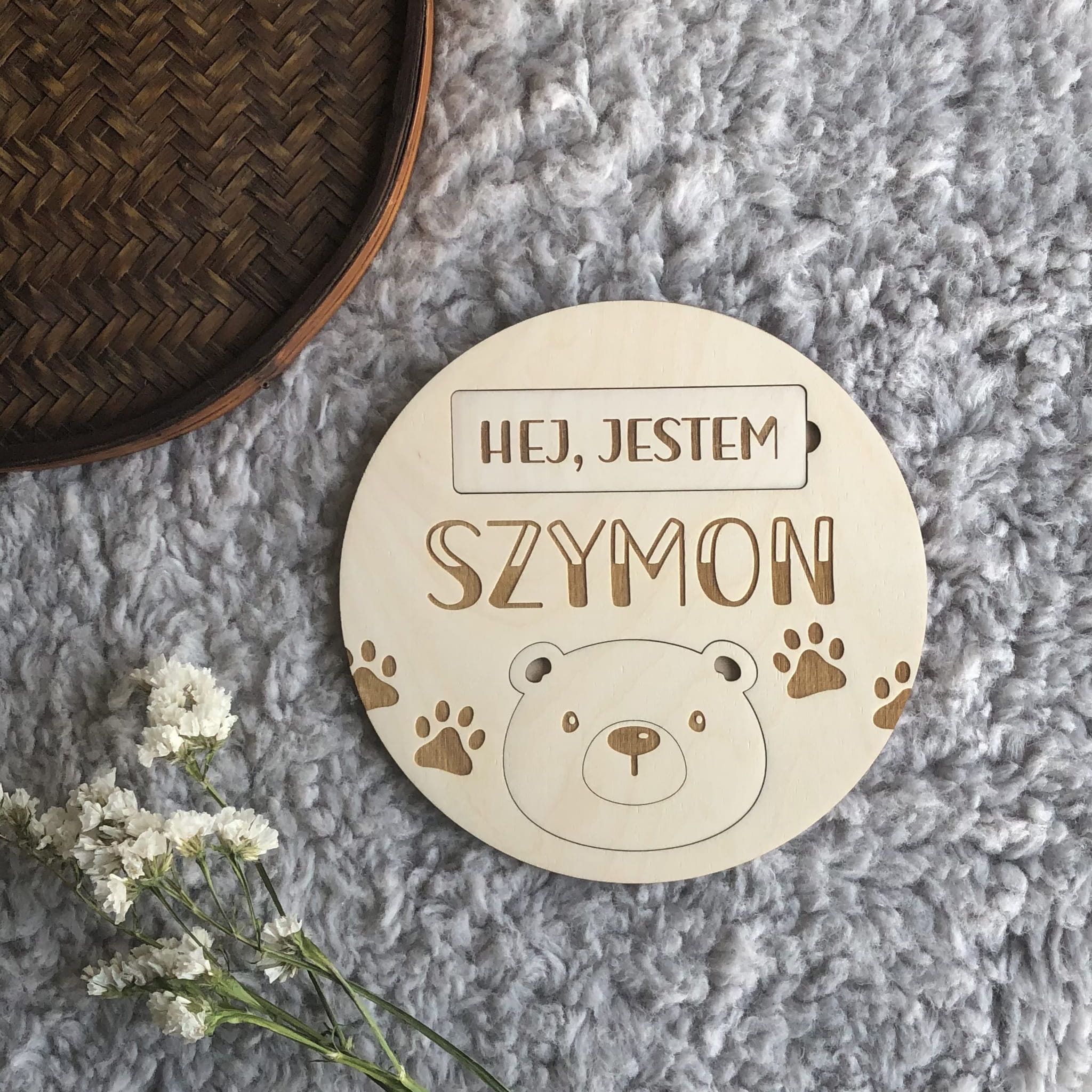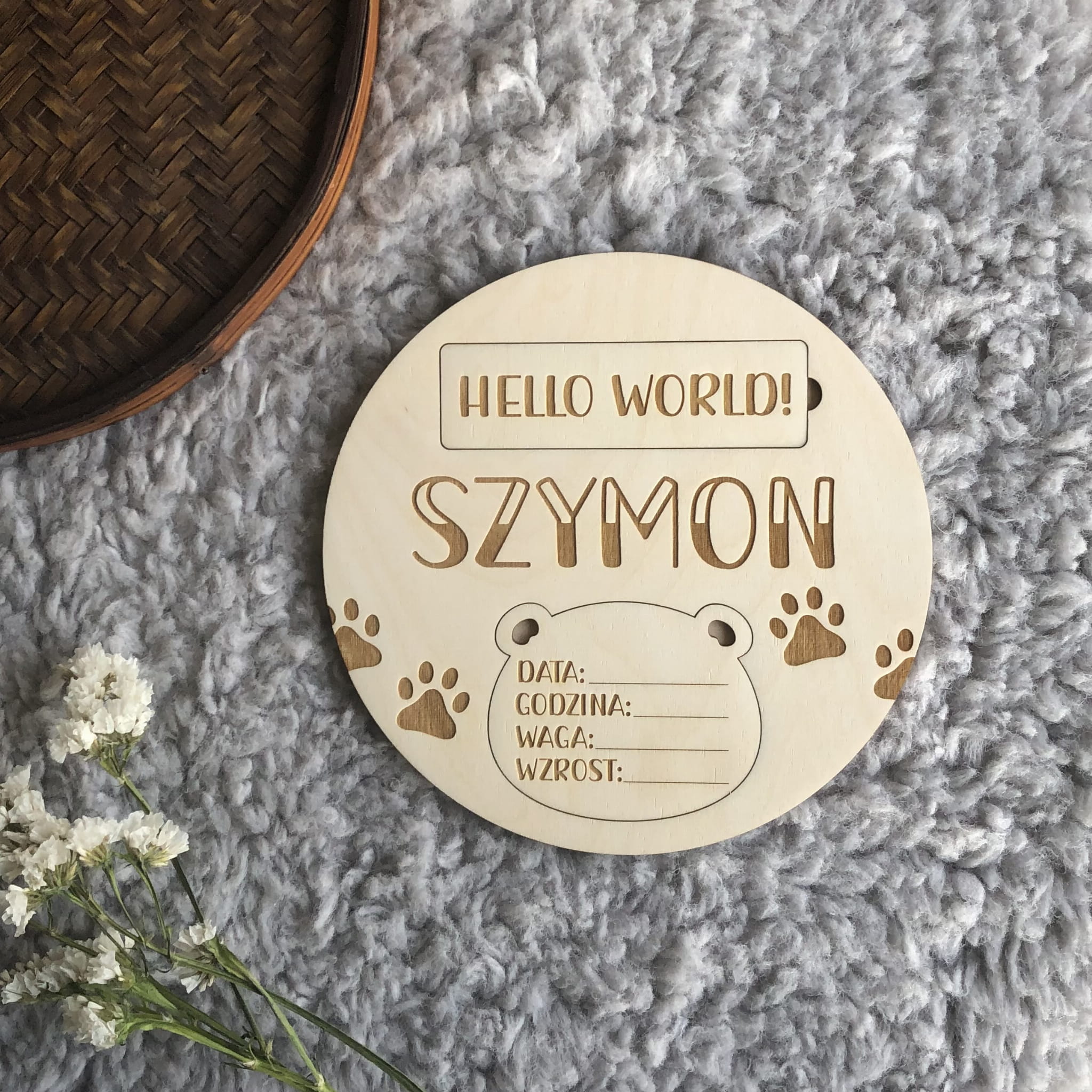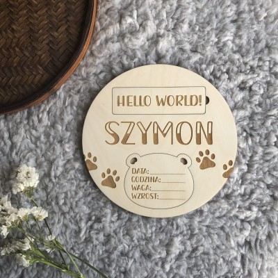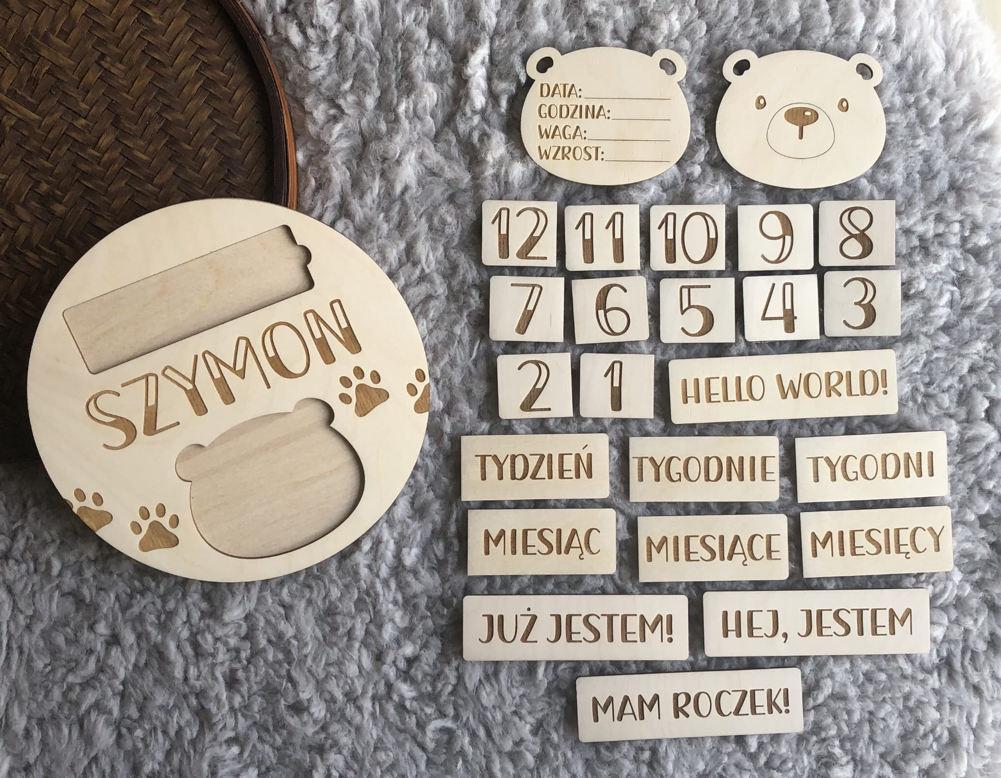 - 4 duże karty z wygrawerowanymi napisami: HELLO WORLD!; JUŻ JESTEM!; HEJ, JESTEM; MAM ROCZEK!