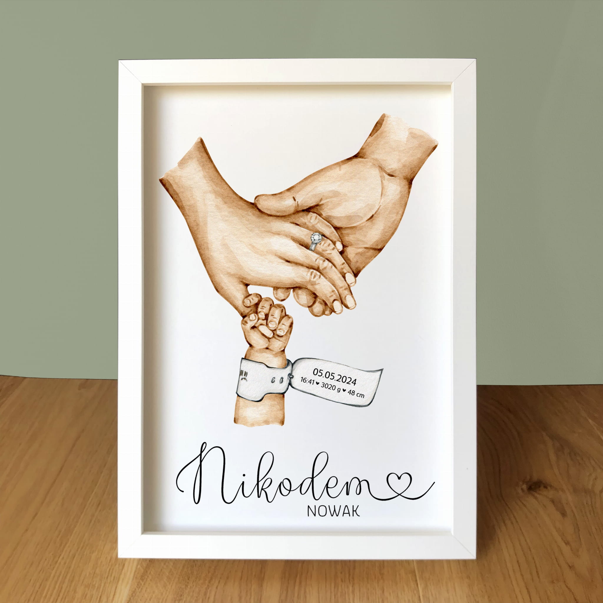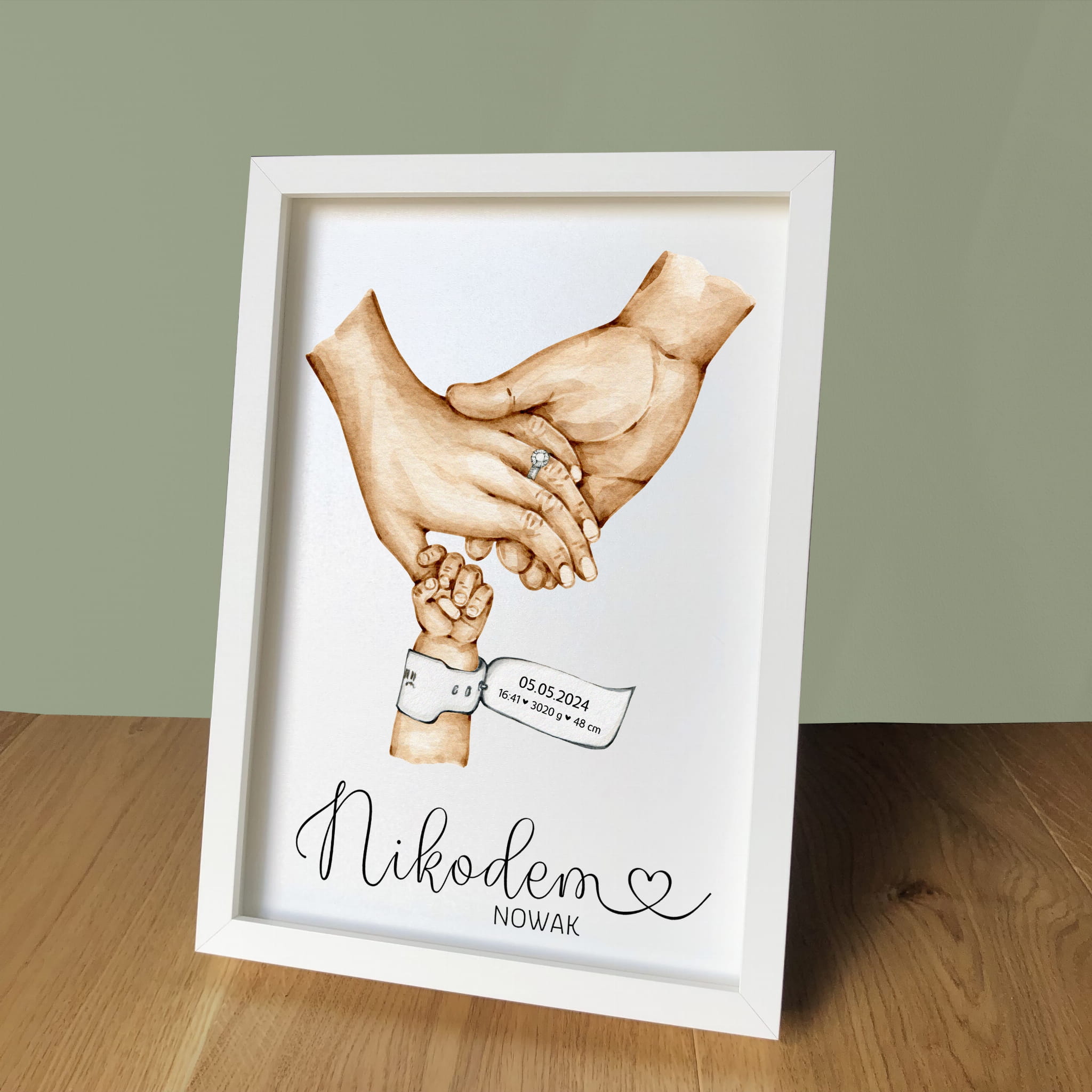 Na środku znajduję się urocza grafika dłoni z "opaską szpitalną" na której nadrukowana jest: godzina, waga, wzrost i data urodzenia.