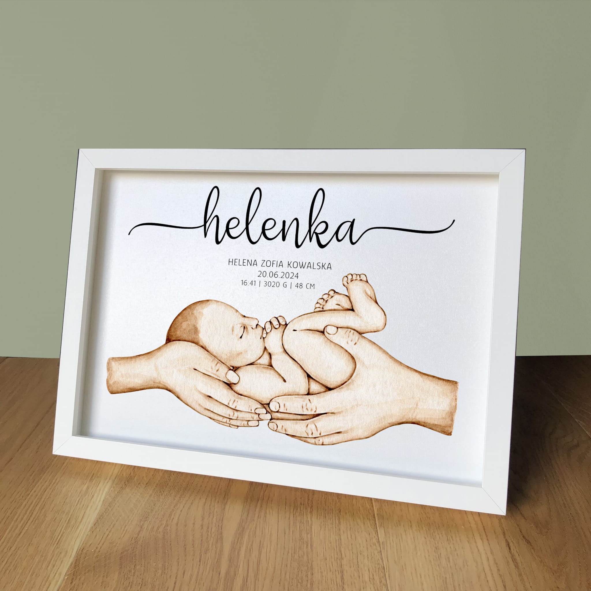Pod spodem jest imię/imiona i nazwisko dziecka, data urodzenia, godzina, waga i wzrost.