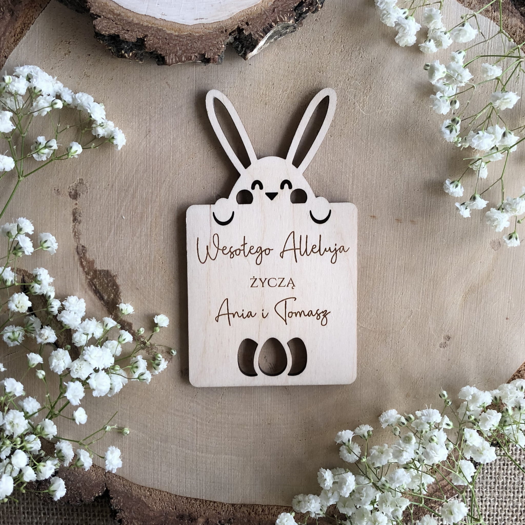 Świetnym pomysłem na drobny prezent jest drewniany magnes Wesołego Alleluja.