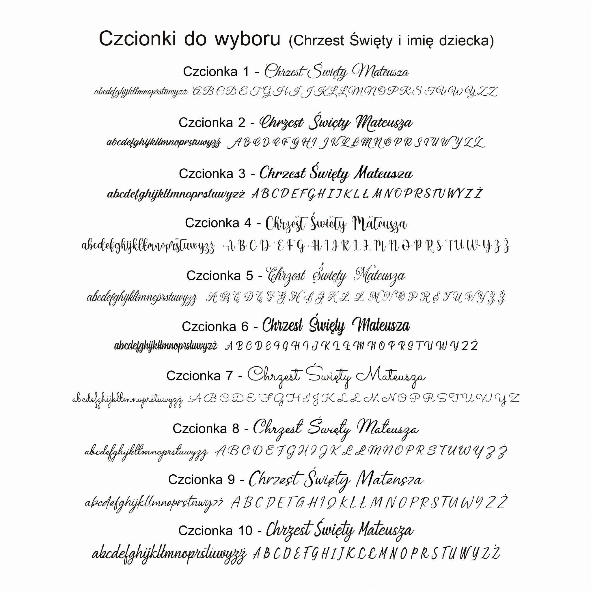 Czcionki do wyboru dotyczą napisu Chrzest Święty i imienia dziecka. Nie ma możliwości zmiany pozostałych krojów czcionek.