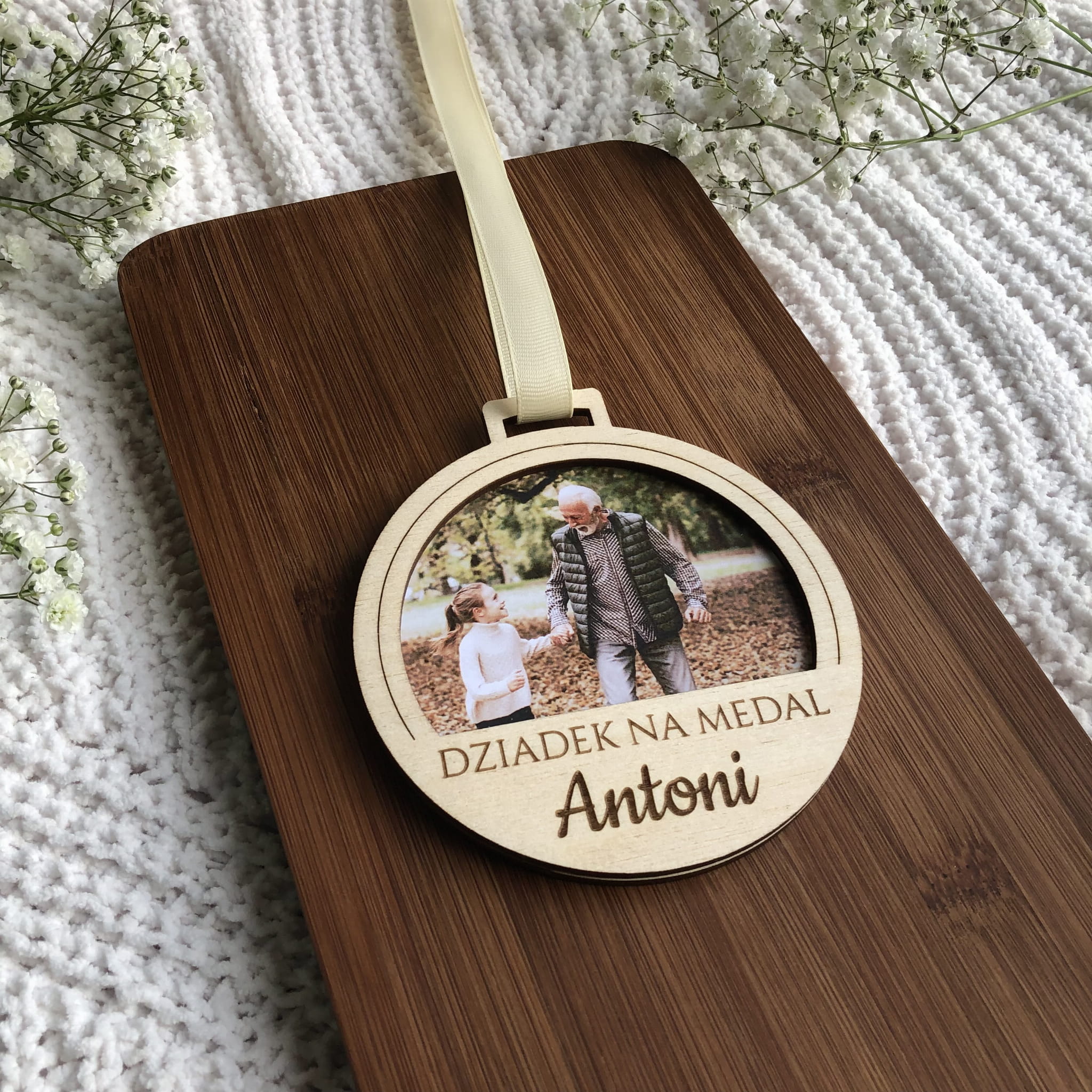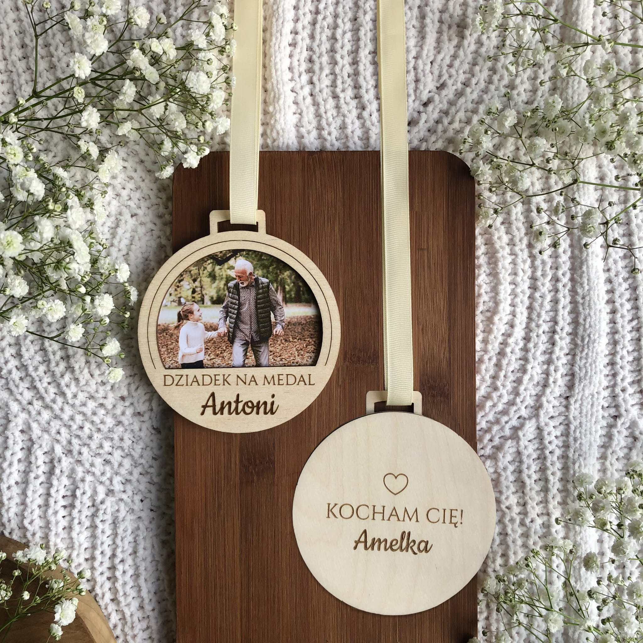 Na jednest stronie znajduję się zdjęcie i napis BABCIA/DZIADEK NA MEDAL i imię. Na odwrocie wygrawerwany jest napis "KOCHAM/Y CIĘ" i imię/imiona wnuków.