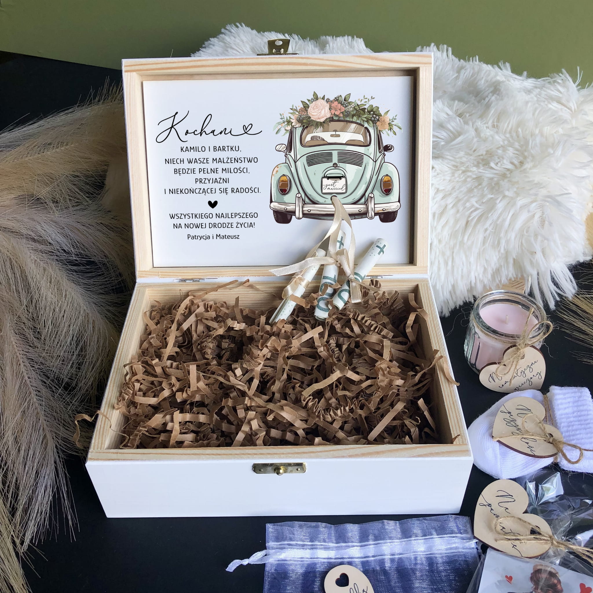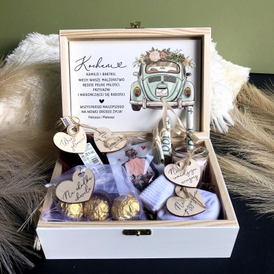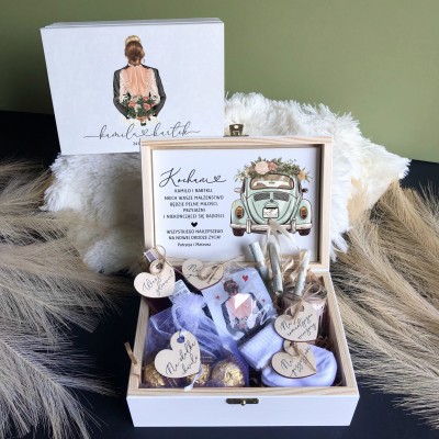 Sosnowe pudełko z życzeniami wewnątrz to idealny pomysł na prezent.