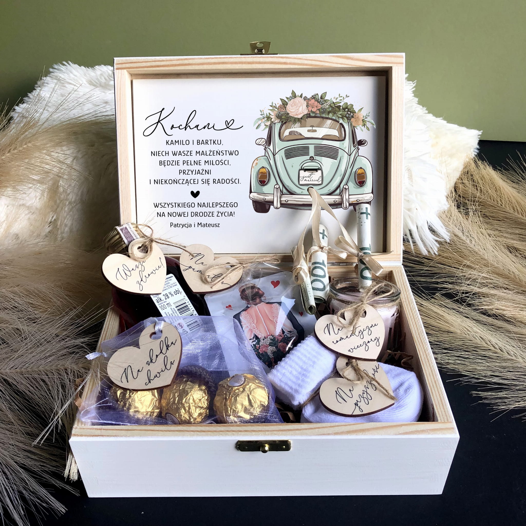 Buteleczka alkoholu i czekoladki NIE SĄ DOŁĄCZANE do zestawu - produkty do samodzielnego uzupełnienia.