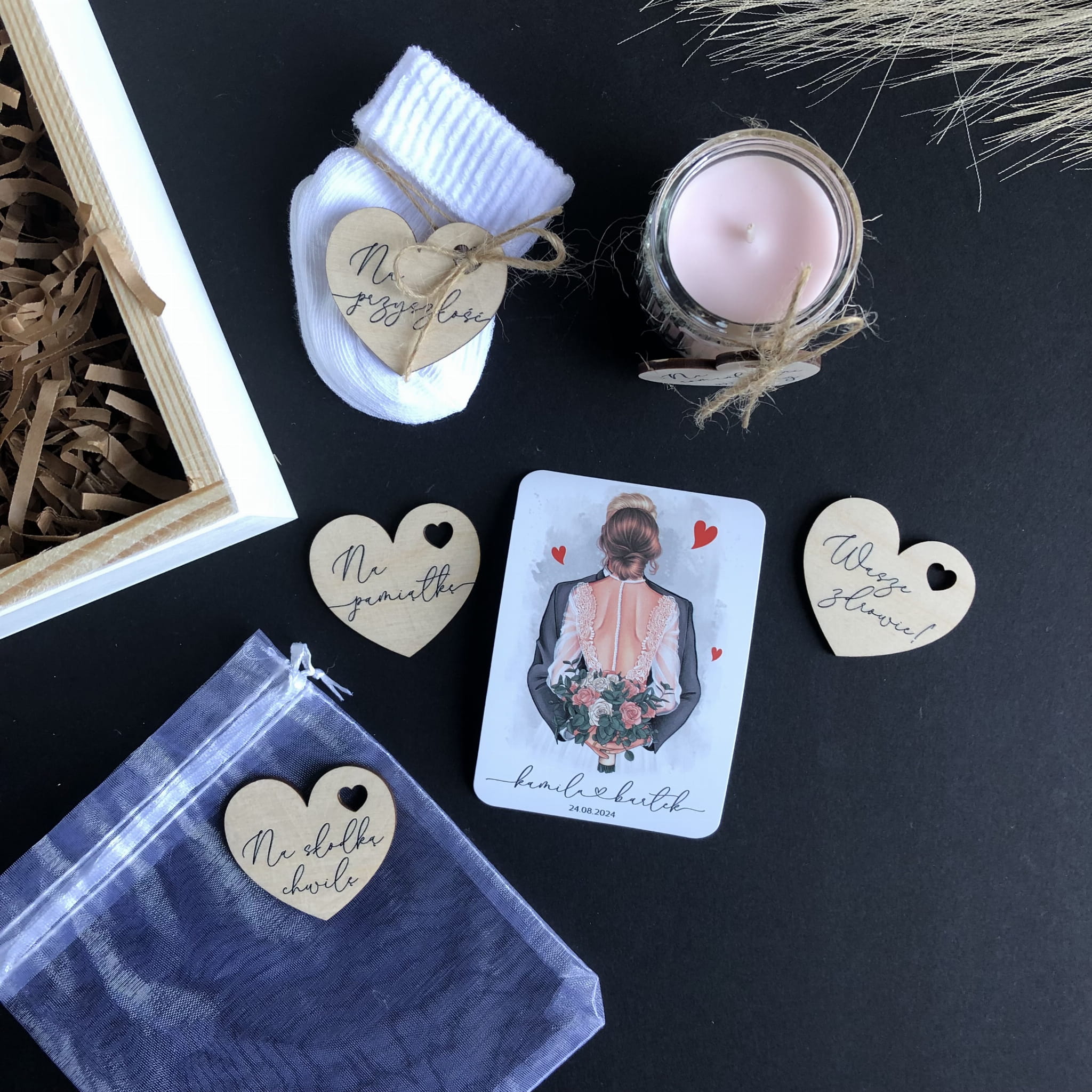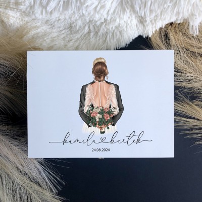 Pudełko ozdobione jest kolorowym nadrukiem, imionami pary młodej i datą ślubu. Do wyboru kilka kolorów włosów młodej pary i 3 kolory garniturów (zdjęcie 6).
