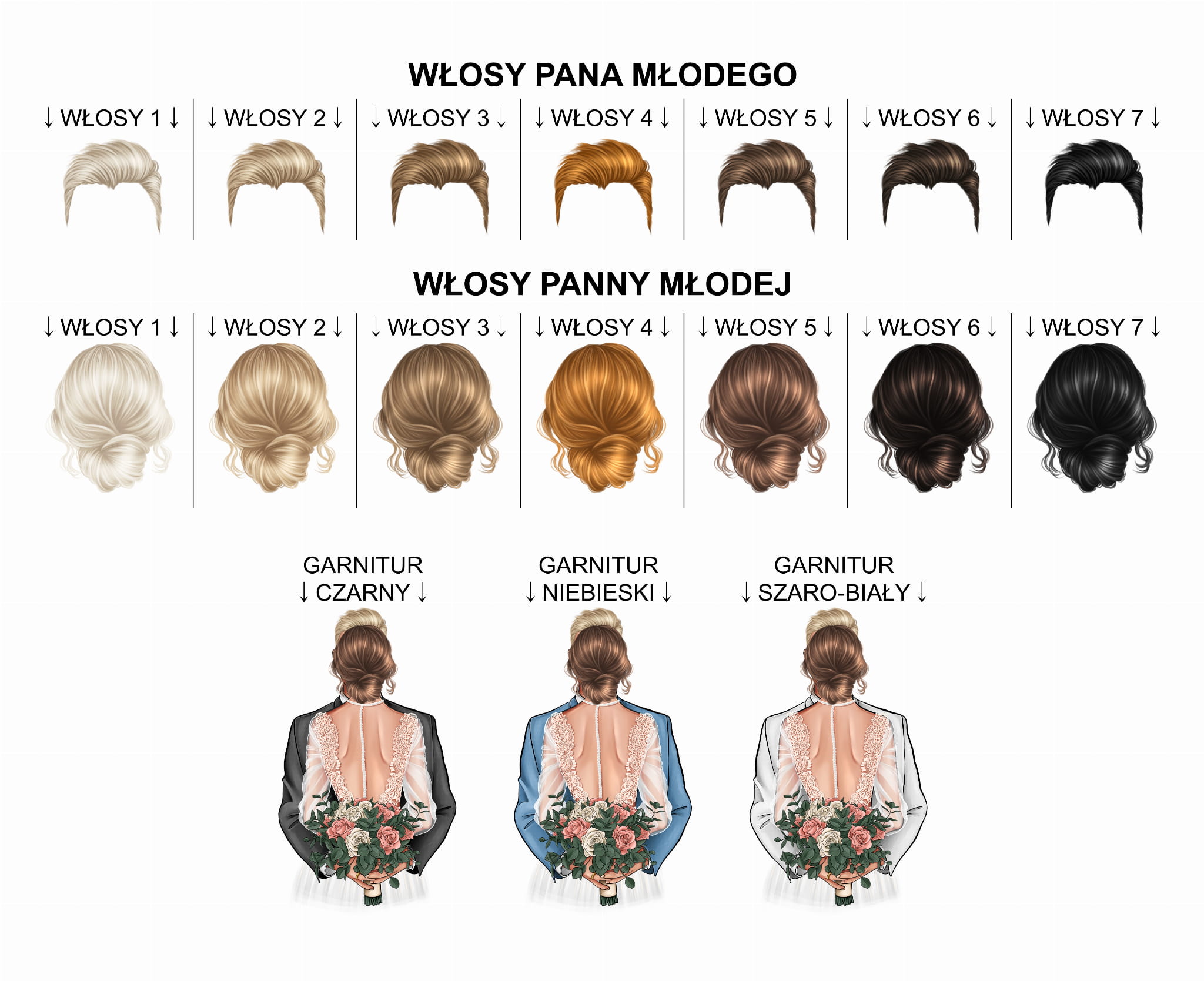 Pudełko ozdobione jest kolorowym nadrukiem, imionami pary młodej i datą ślubu. Do wyboru kilka kolorów włosów młodej pary i 3 kolory garniturów (zdjęcie 6).
