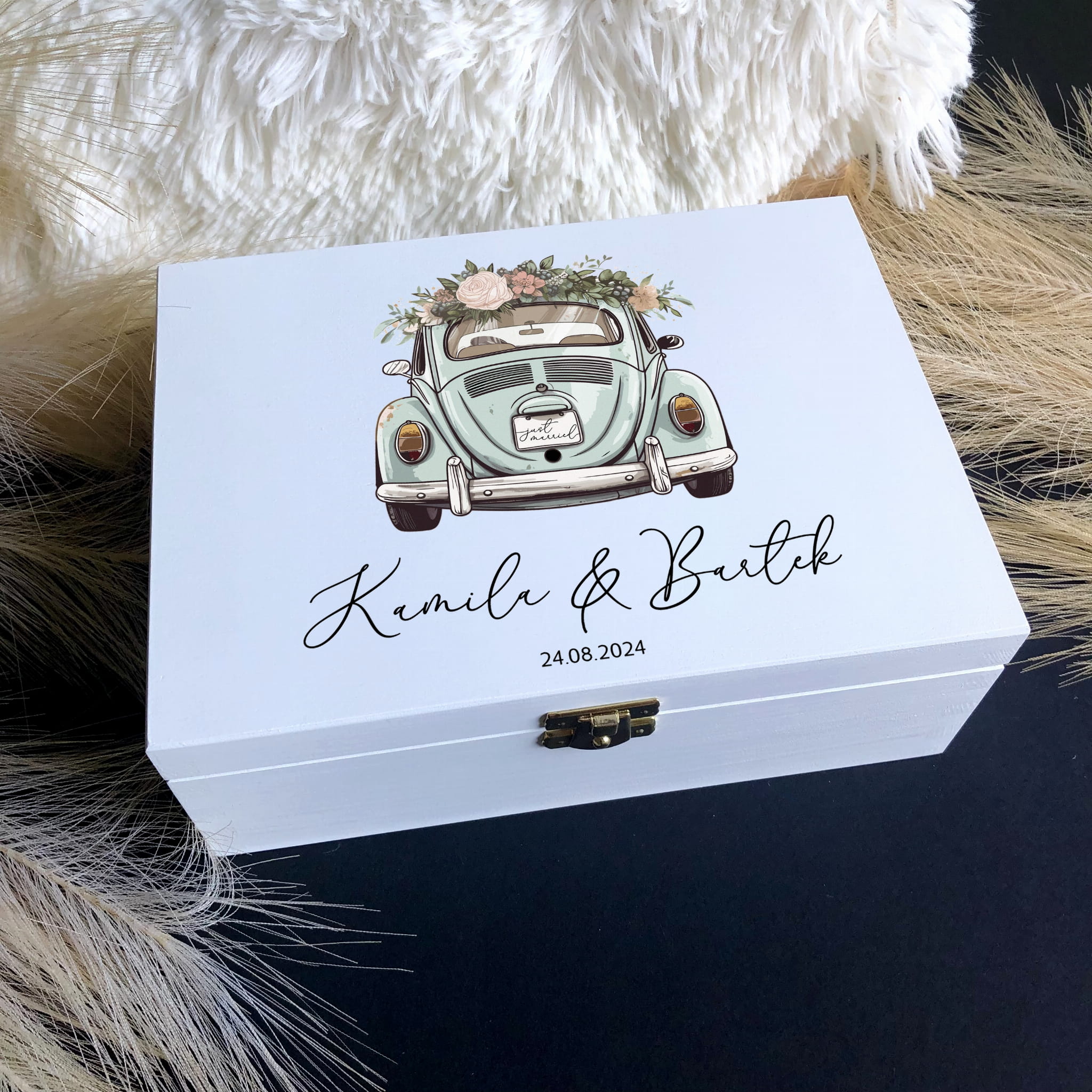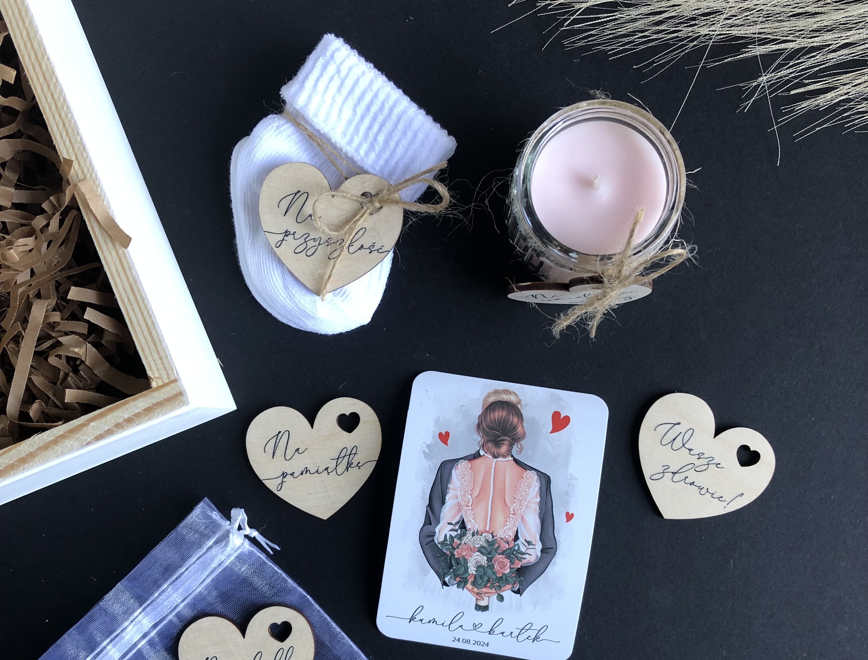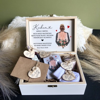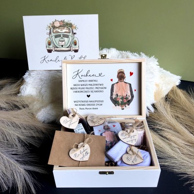 Życzenia są nadrukowane na białej HDF i wklejone do pudełka. Poza życzeniami nadrukowana jest grafika Pary Młodej (Do wyboru kilka kolorów włosów młodej pary i 3 kolory garniturów - zdjęcie 4).