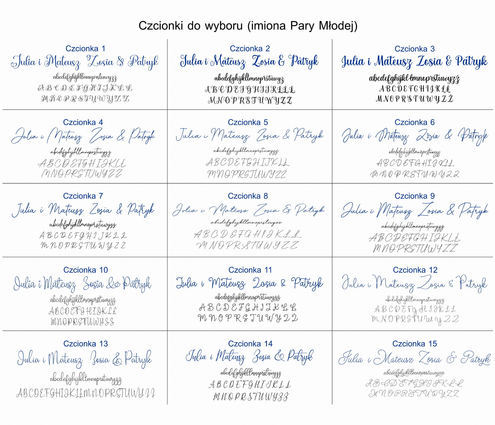 Czcionki do wyboru dotyczą imion pary młodej na pudełku. Nie ma możliwości zmiany pozostałych krojów czcionek.