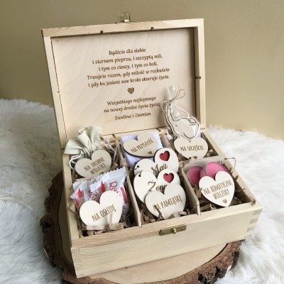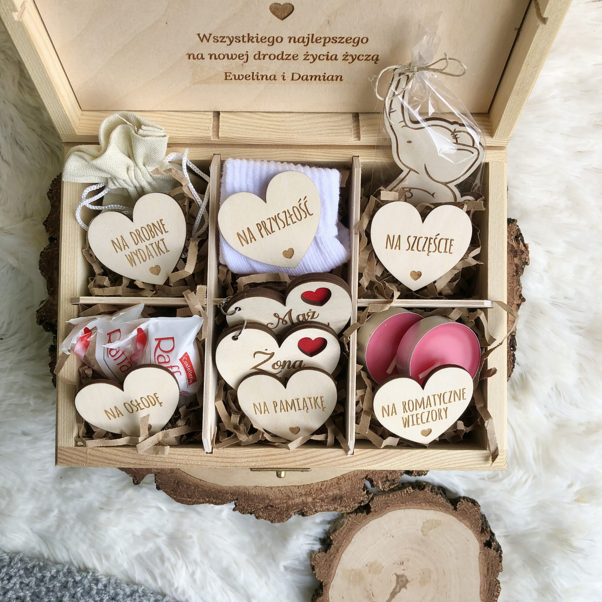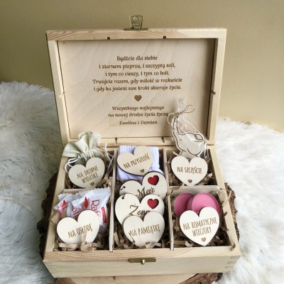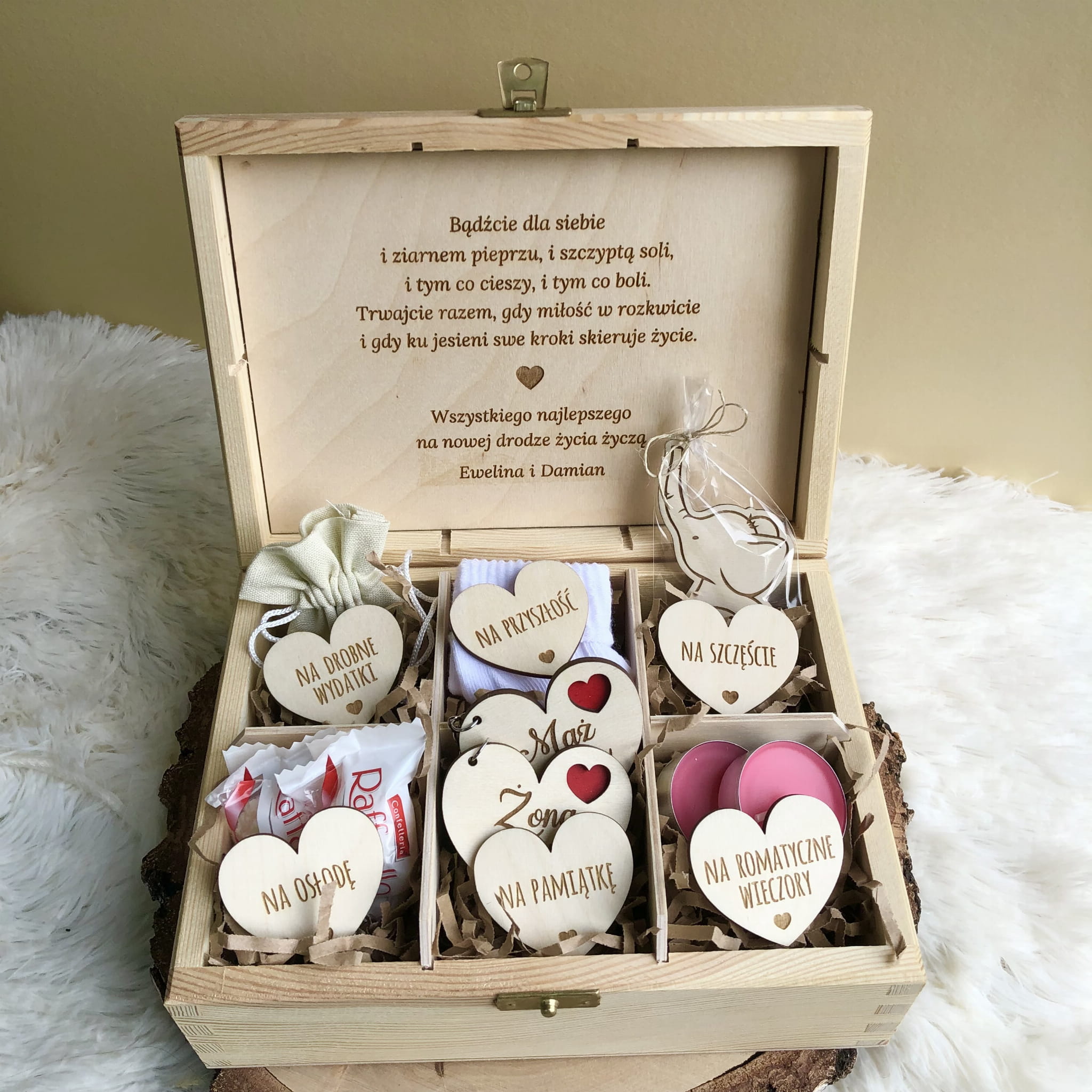 Pudełko z grawerem z zewnątrz i życzeniami wewnątrz. Wymiary pudełka: 22 cm x 16 cm x 8 cm. Materiał: naturalne drewno sosnowe + sklejka. Grawer wykonany precyzyjną techniką laserową. Życzenia są wygrawerowane na sklejce drewnianej i wklejone do pudełka. W każdej przegródce oprócz produktu jest wypełnie w 4 kolorach do wyboru (brązowe ECO, różowe, niebieskie lub czarne).