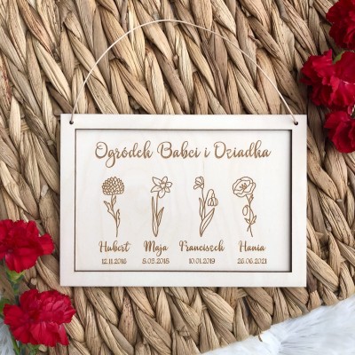 Drewniany obrazek z wygrawerowanymi kwiatami, imionami wnuczków i datami urodzenia.