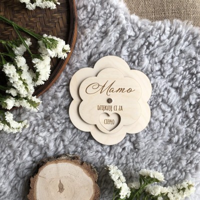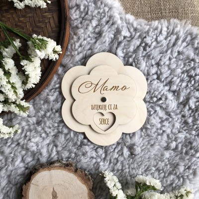 Na kwiatku wygrawerowany jest napis "Mamo dziękuję Ci za" i 6 rzeczy za które dziękujesz Mamie.