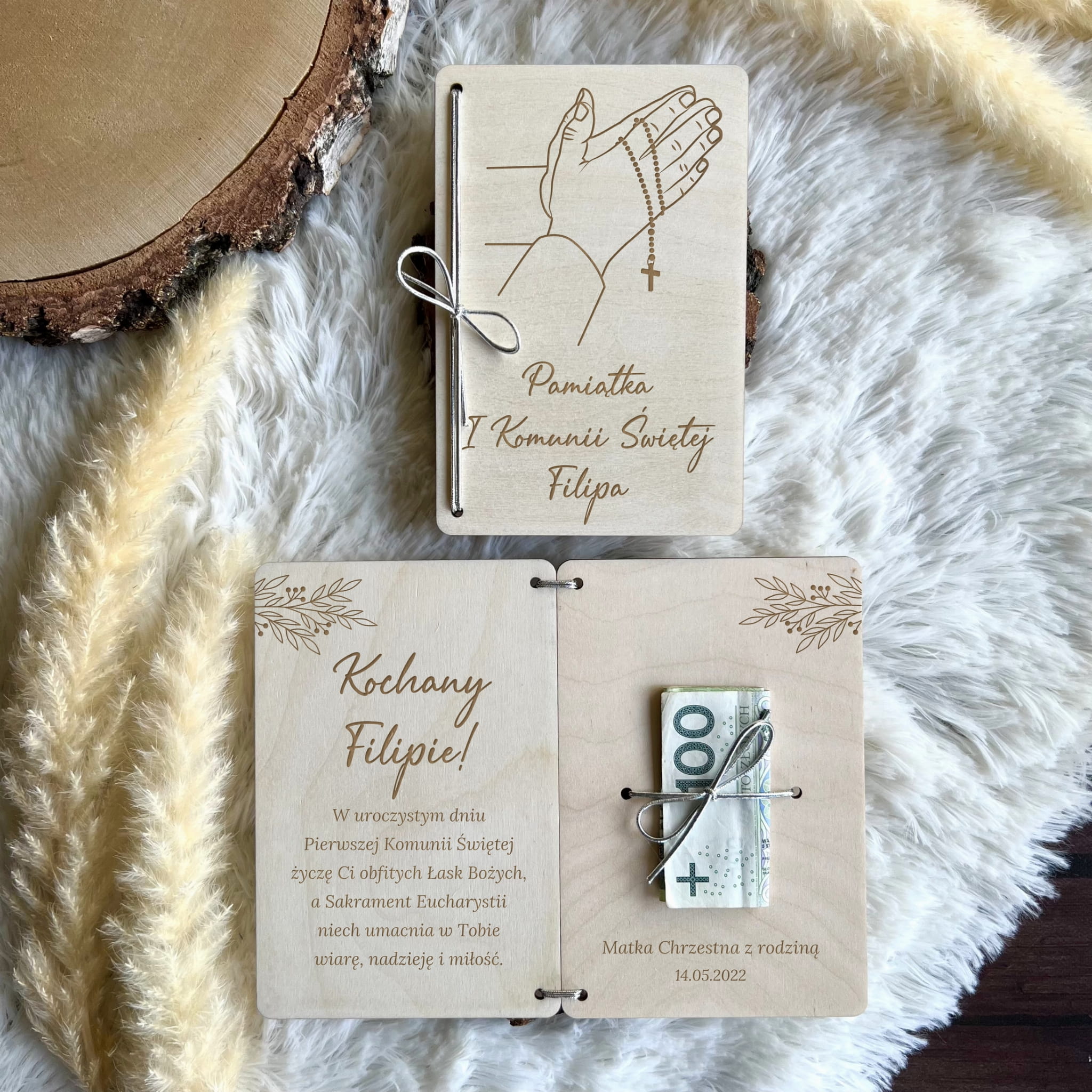 Pamiątka I Komunii Św. w formie drewnianej kartki z życzeniami będzie wspaniałą pamiątką na wiele lat.