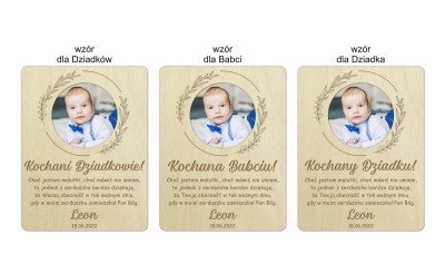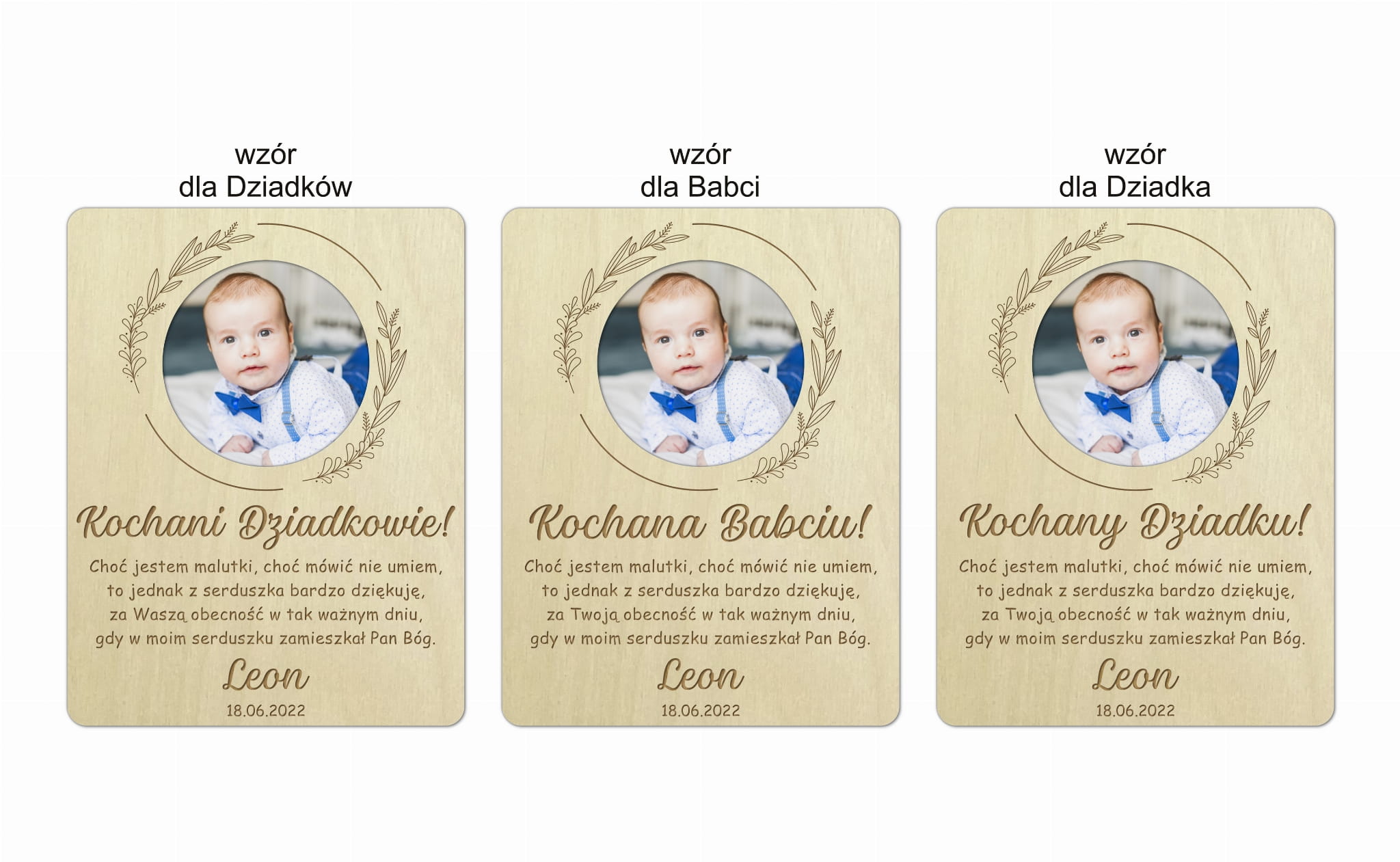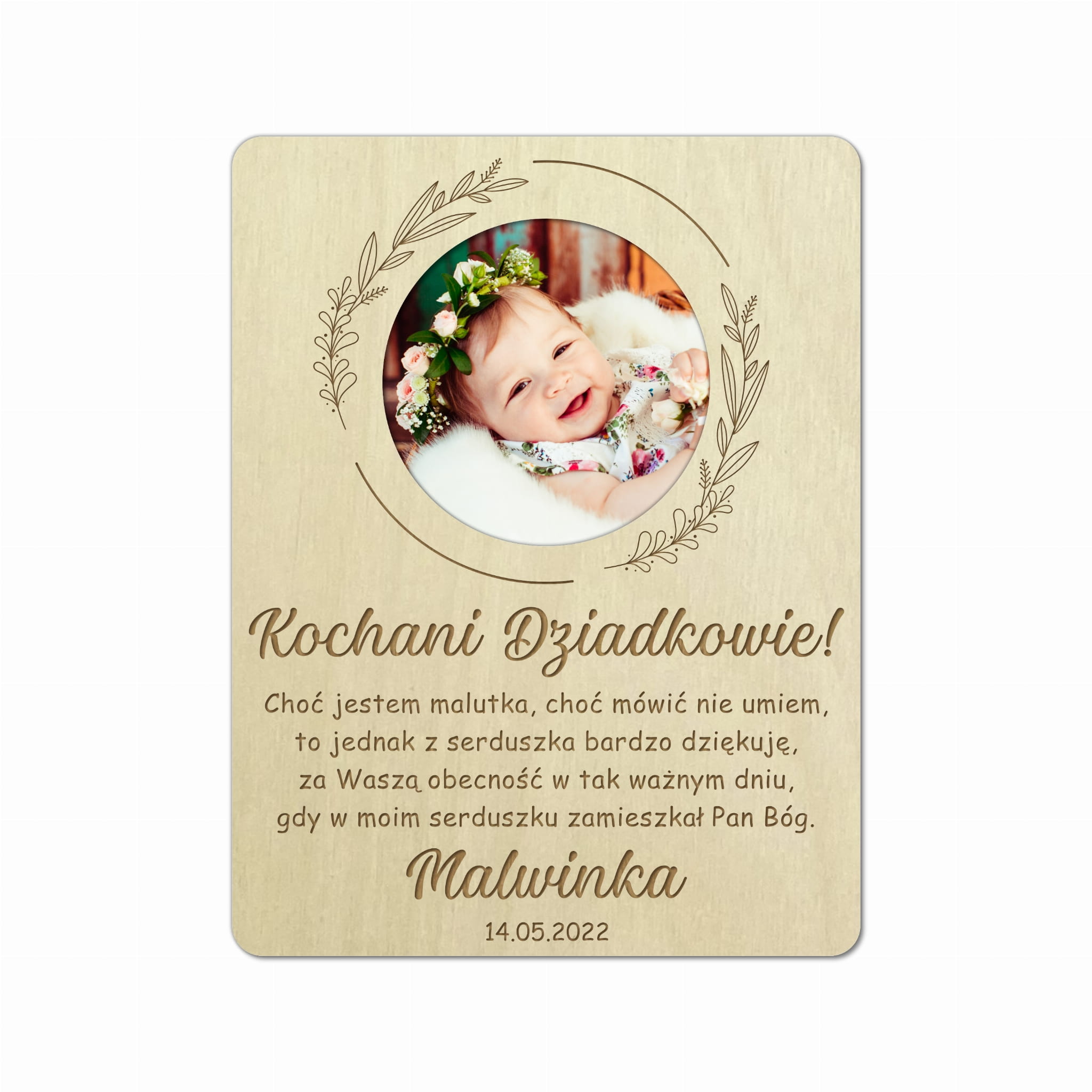 Drewniana kartka ze zdjęciem i z wygrawerowanym podziękowaniem będzie wyjątkową pamiątką dla Babci i Dziadka.