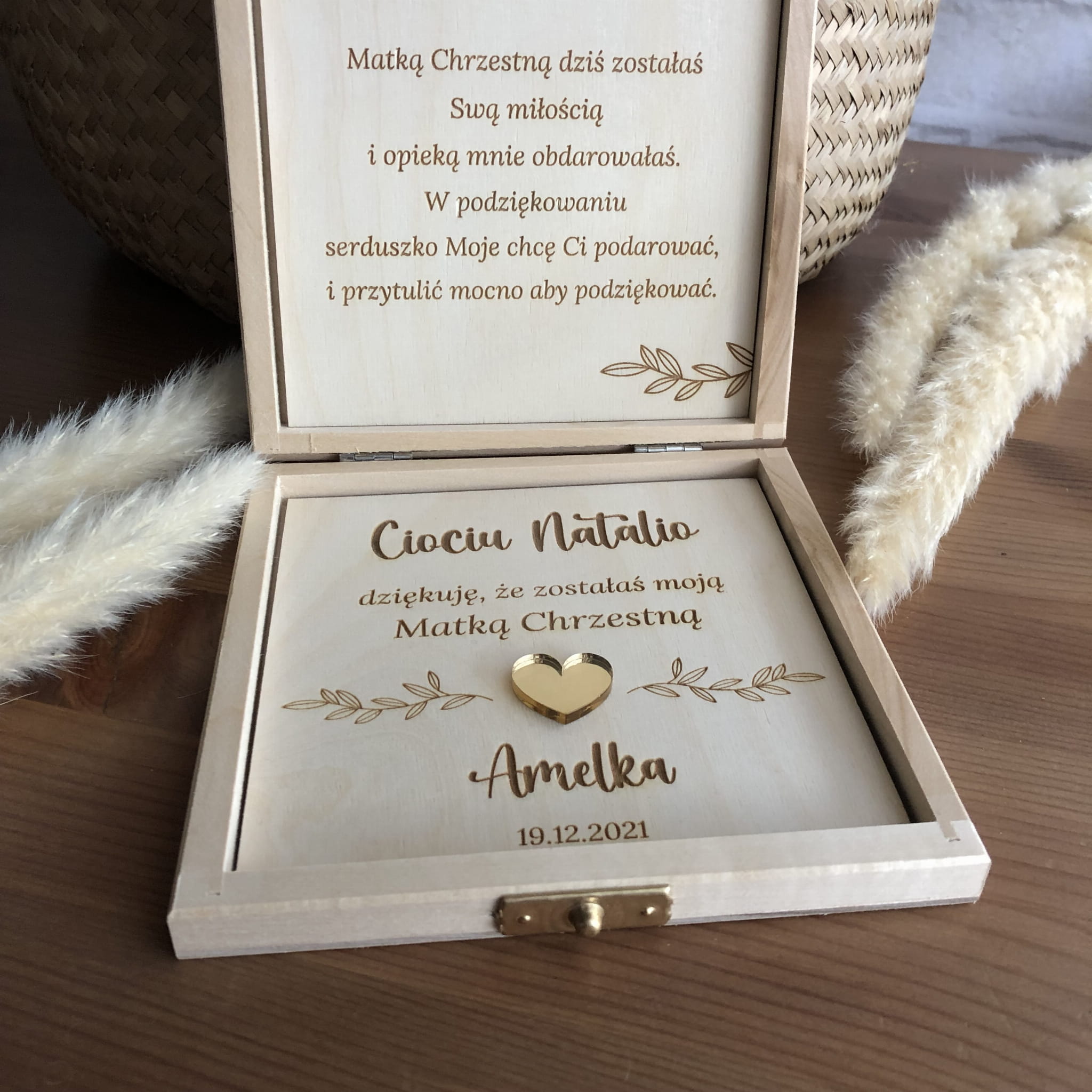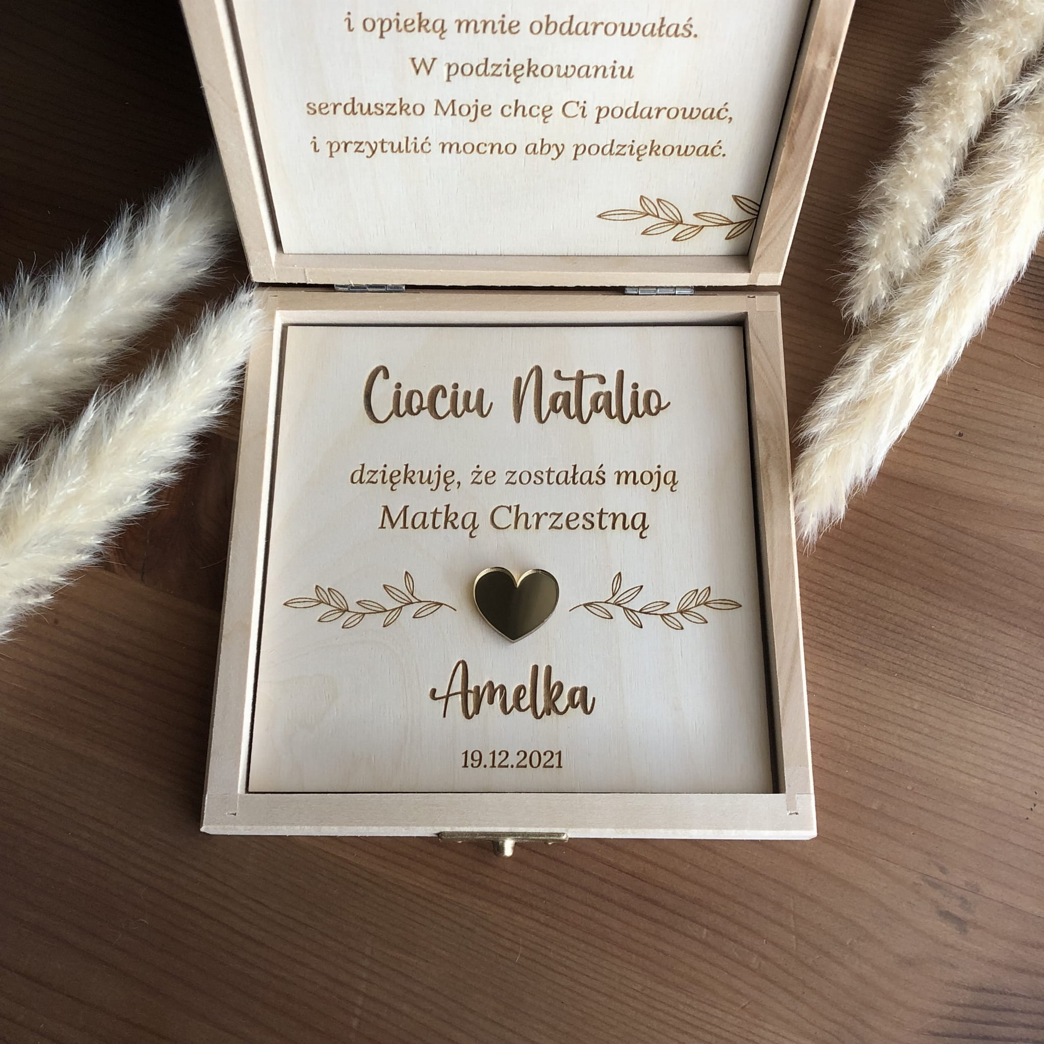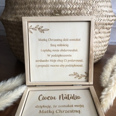 Wierszyk i podziękowanie wygrawerowane są na sklejce drewnianej i wklejone do pudełka w górnej i dolnej części.