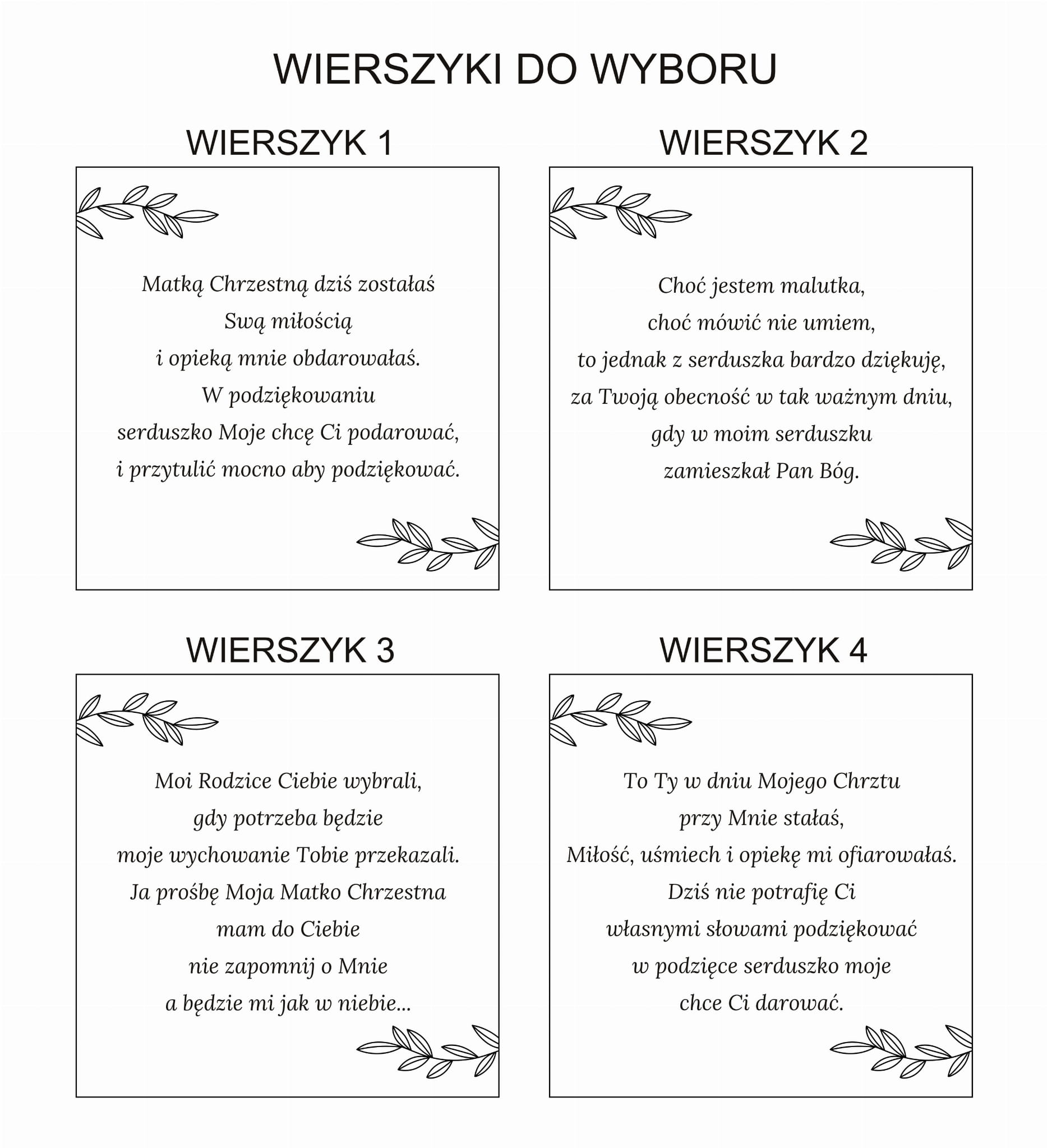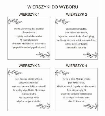 Wewnątrz wygrawerowany jest wierszyk, adresat, "dziękuję, że zostałaś moją Matką Chrzestną", podpis i data.