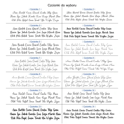 Czcionki do wyboru dotyczą imienia dziecka na pudełku, zwrotu Ciociu (imię) i imienia dziecka wewnątrz. Nie ma możliwości zmiany pozostałych krojów czcionek.