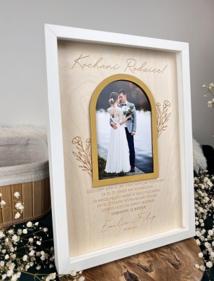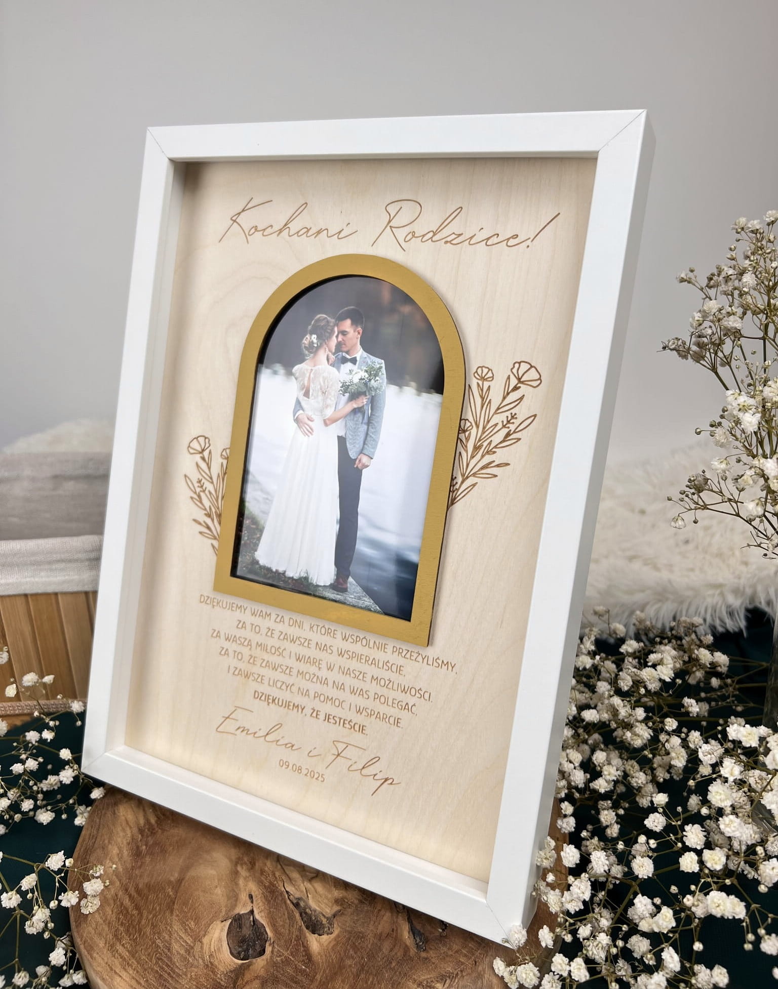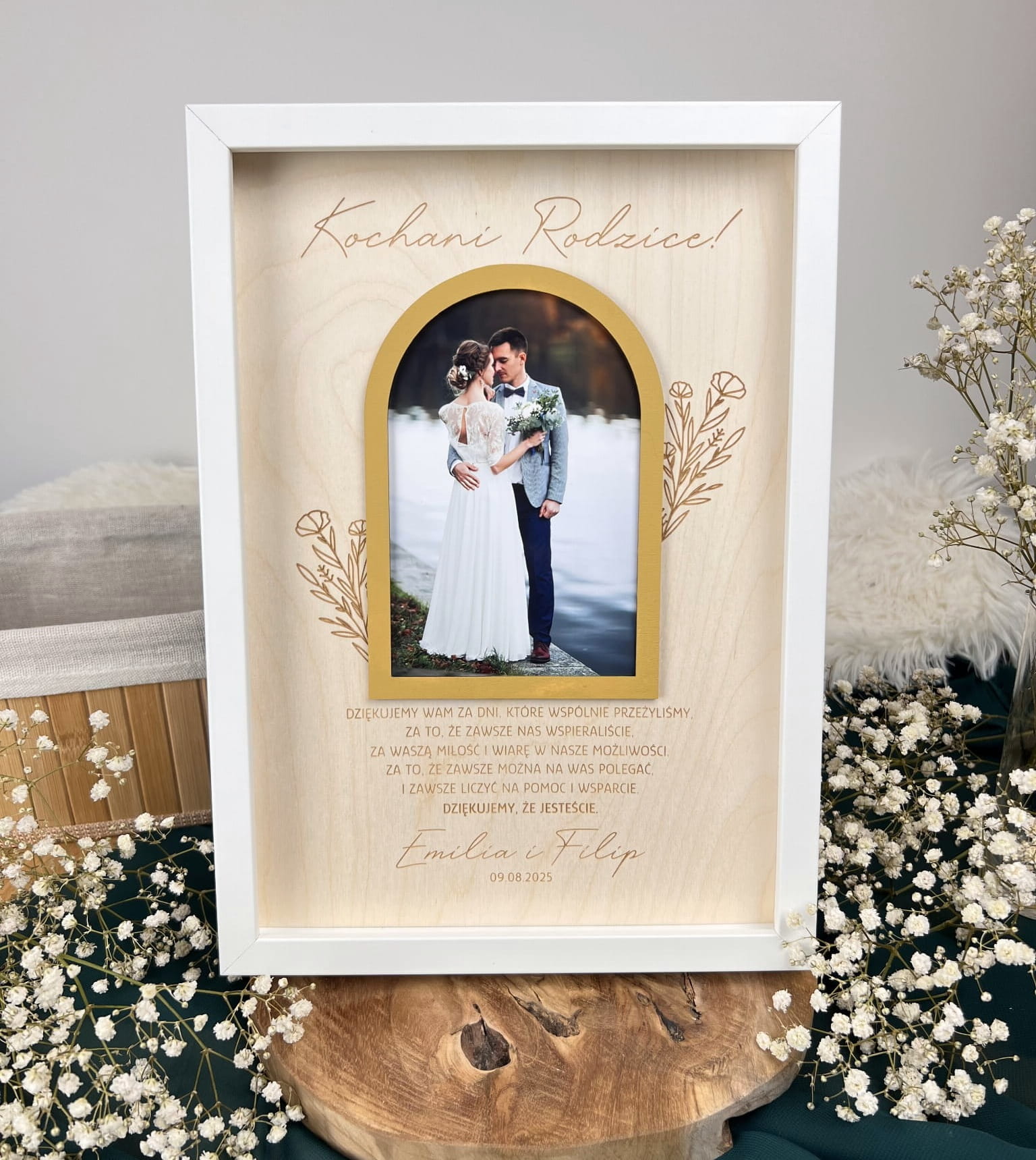 Pod ramką wygrawerowana jest jest treść podziękowania, Wasze imiona i data ślubu.