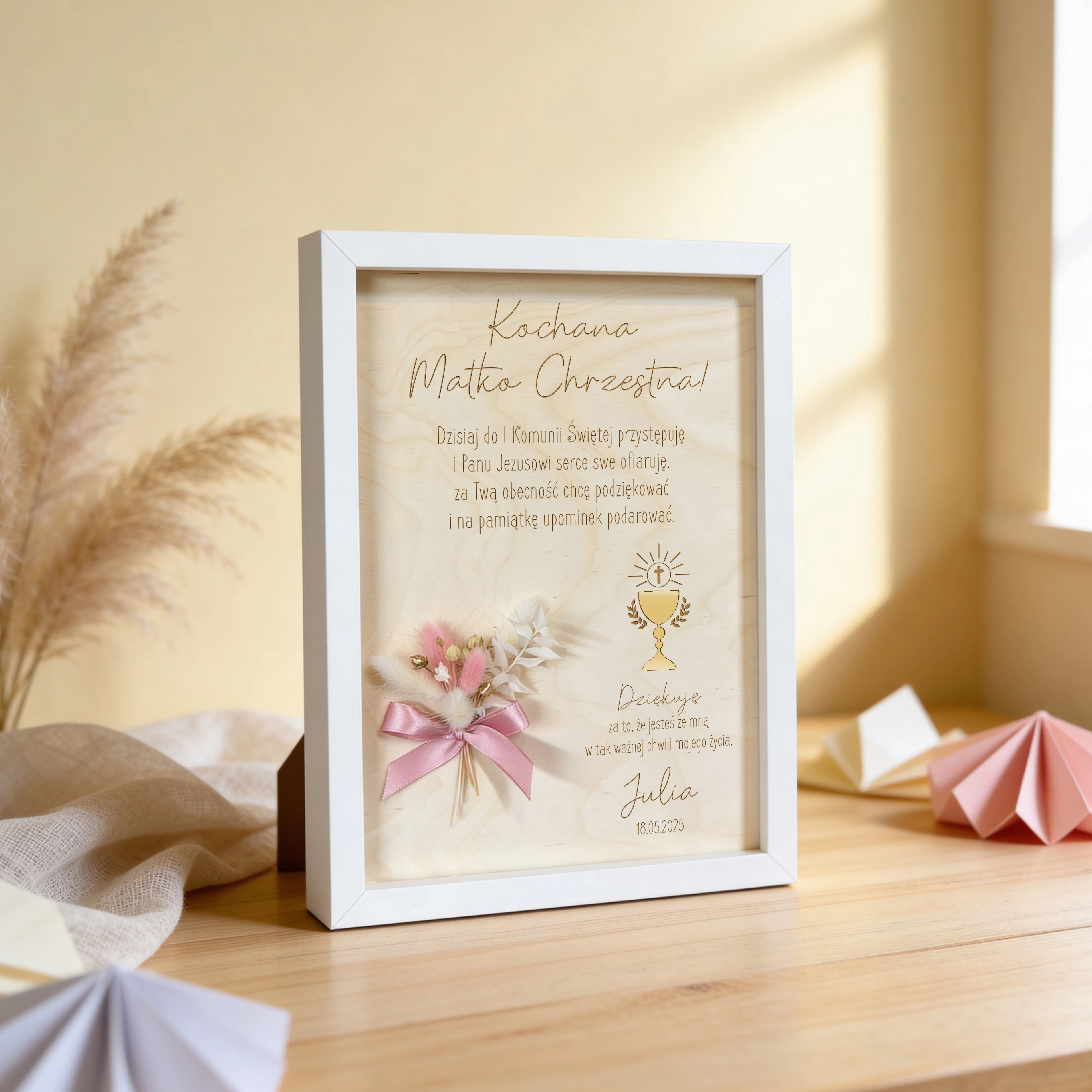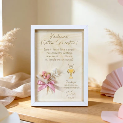 Eleganckie podziękowanie w formie ramki, stworzone jako wyjątkowa pamiątka z okazji Pierwszej Komunii Świętej.