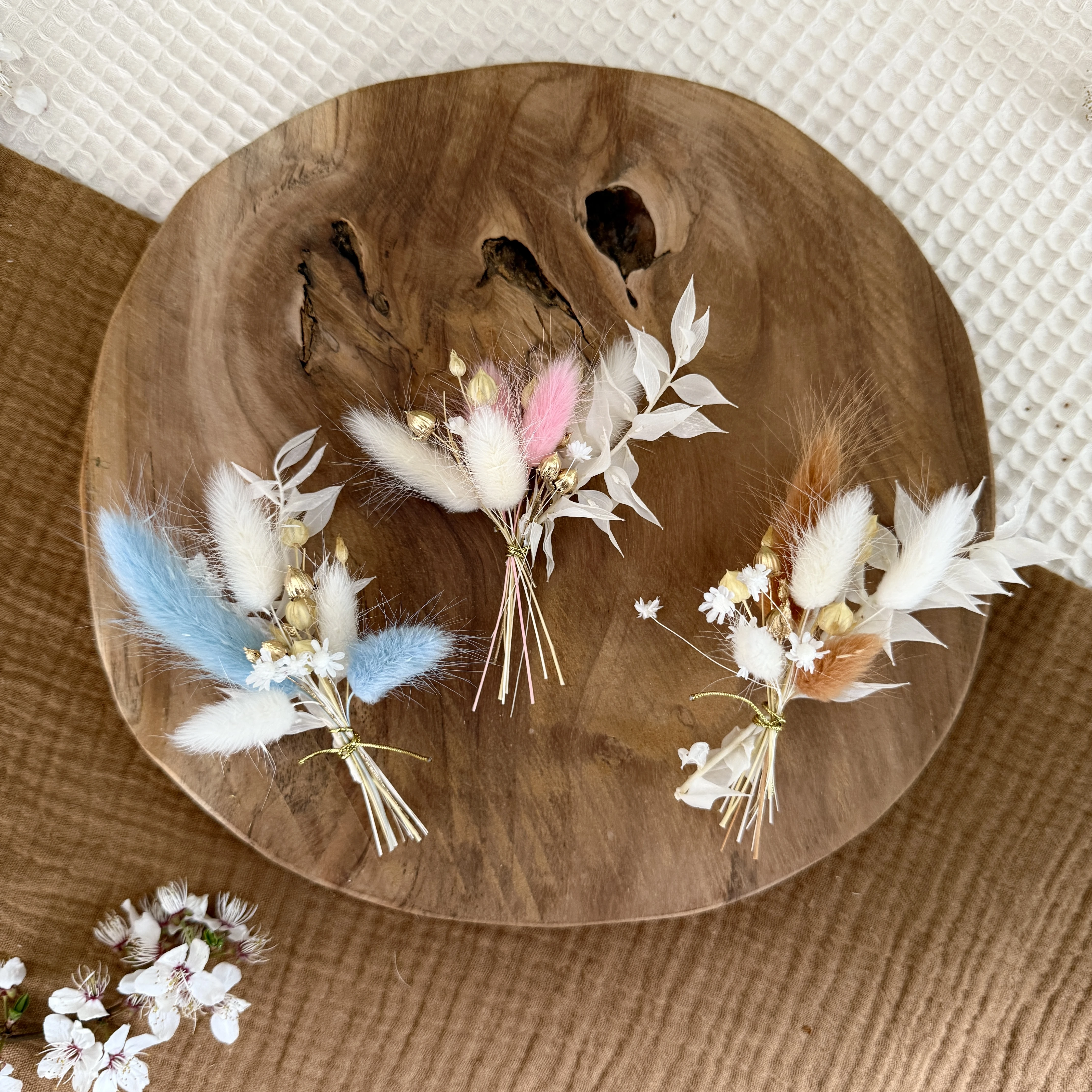 Bukiecik wykonywany jest ręcznie, dlatego każdy egzemplarz może się nieznacznie różnić. Odcień oraz układ suszu mogą się delikatnie zmieniać w zależności od dostępności materiałów.