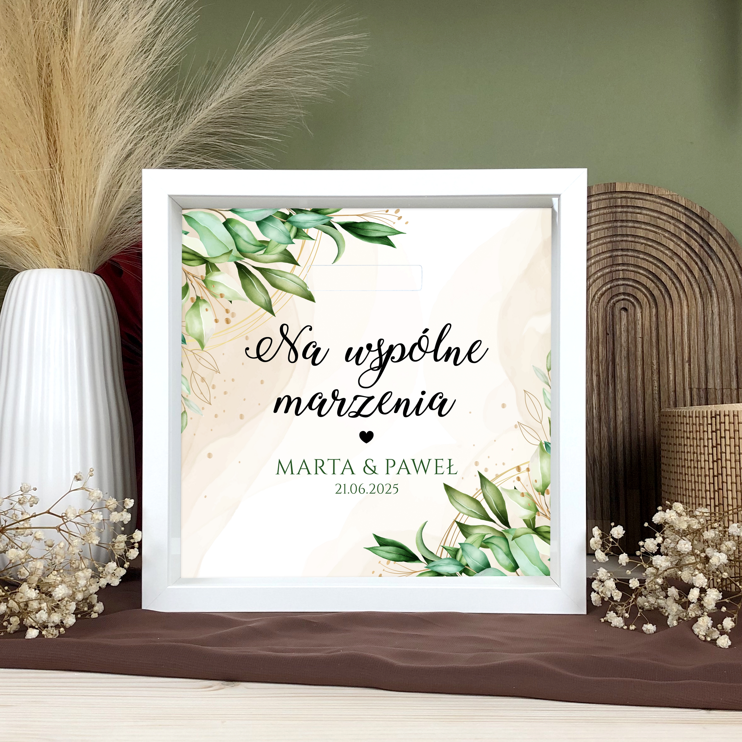 - Ścianka skarbonki ozdobiona jest kolorowym nadrukiem z napisem Na wspólne marzenia, imionami pary młodej i datą ślubu.