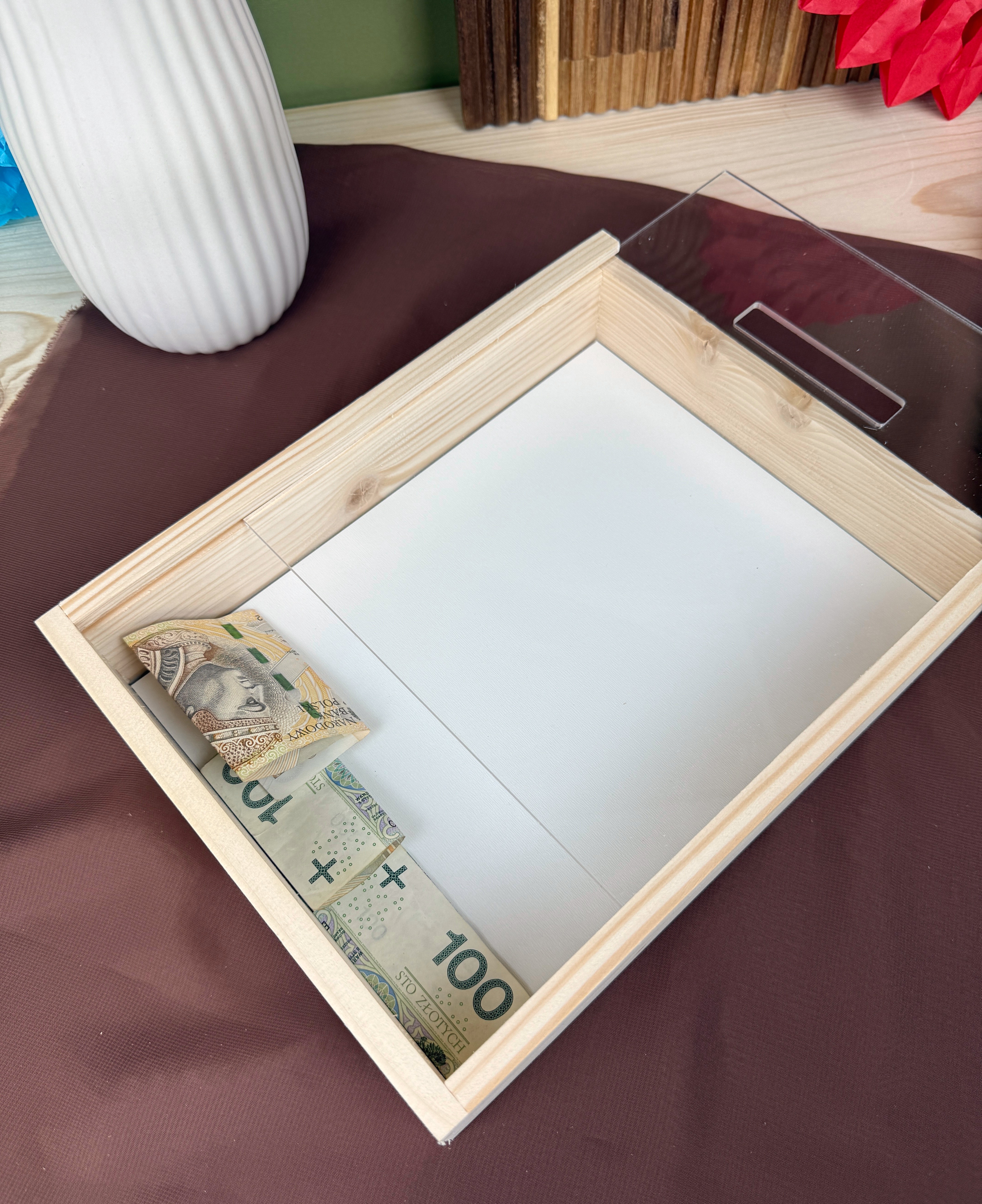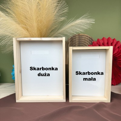 Personalizowana skarbonka z kolorowym nadrukiem. Z przodu znajduje się przezroczysta pleksa z wyciętym otworkiem do wrzucania pieniędzy.