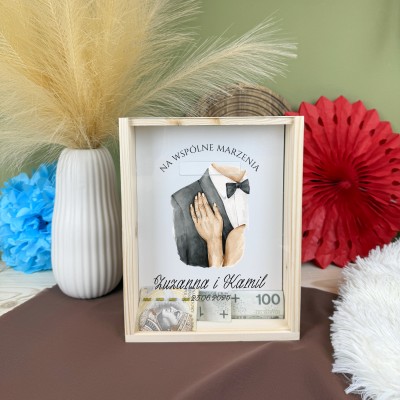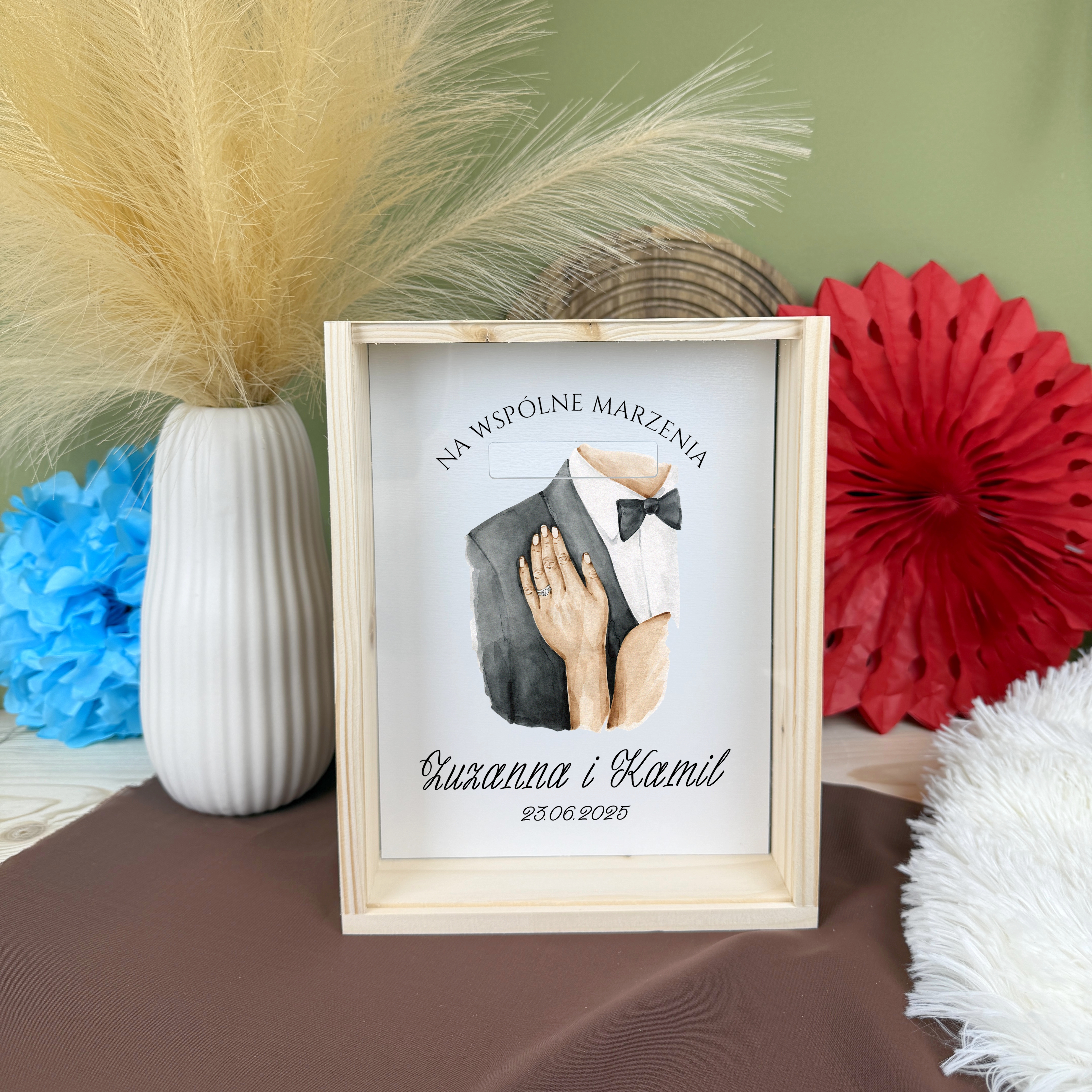Imiona pary młodej i data ślubu - umieszczone są na przedniej pleksi - dzięki czemu nawet po zapełnieniu całej skarbonki są dalej widoczne :)