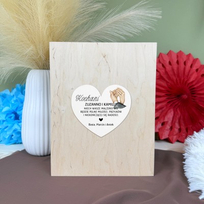 - Z tyłu przyklejone jest serduszko z życzeniami "Kochani (imiona) NIECH WASZE MAŁŻEŃSTWO BĘDZIE PEŁNE MIŁOŚCI, PRZYJAŹNI I NIEKOŃCZĄCEJ SIĘ RADOŚCI."