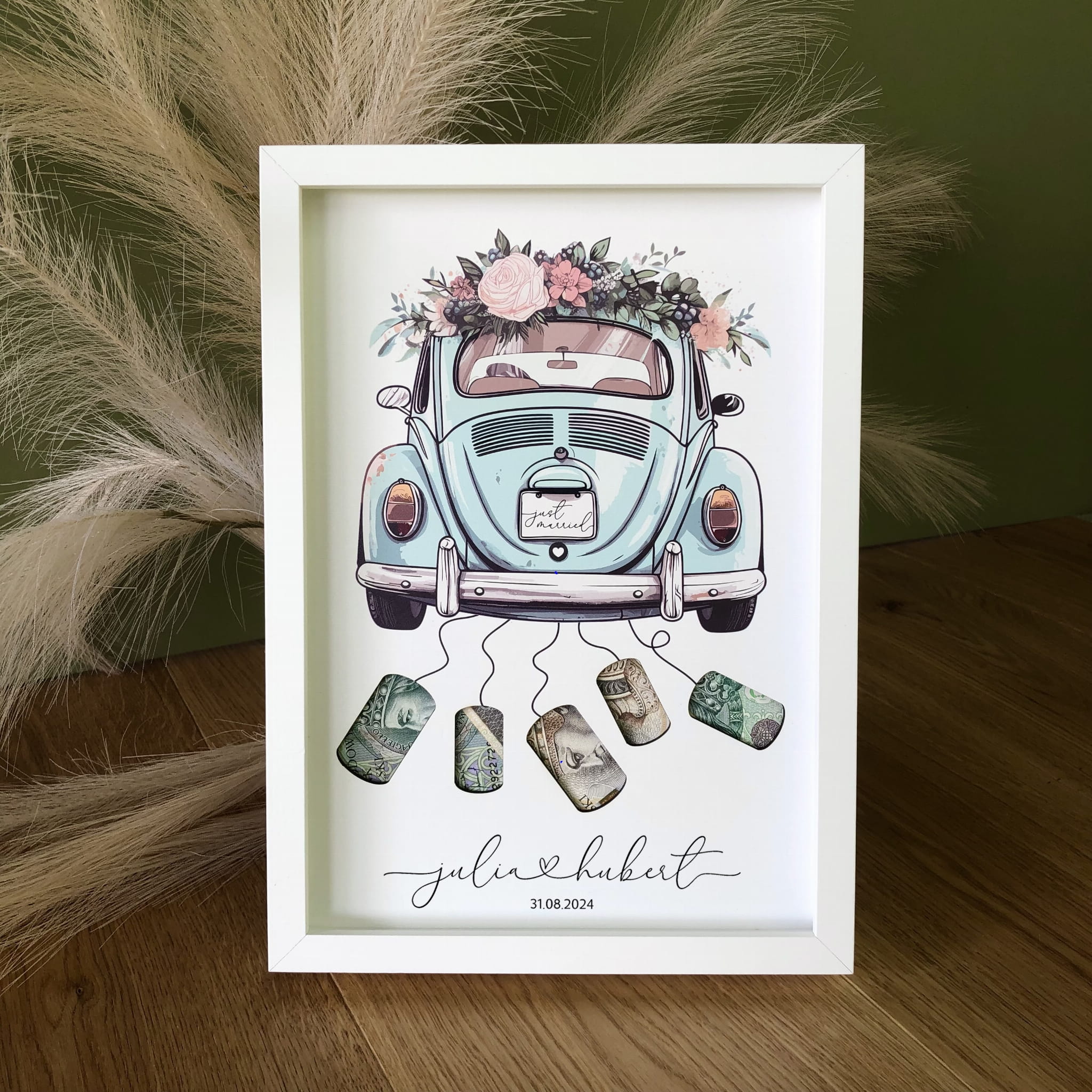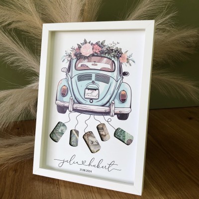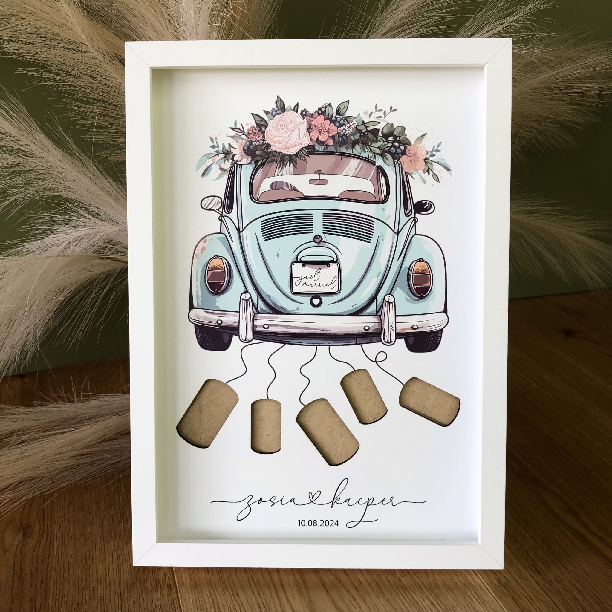W ramce umieszczona jest biała HDF na której nadrukowany jest samochód. Pod samochodem są wycięte "puszki" na banknoty.