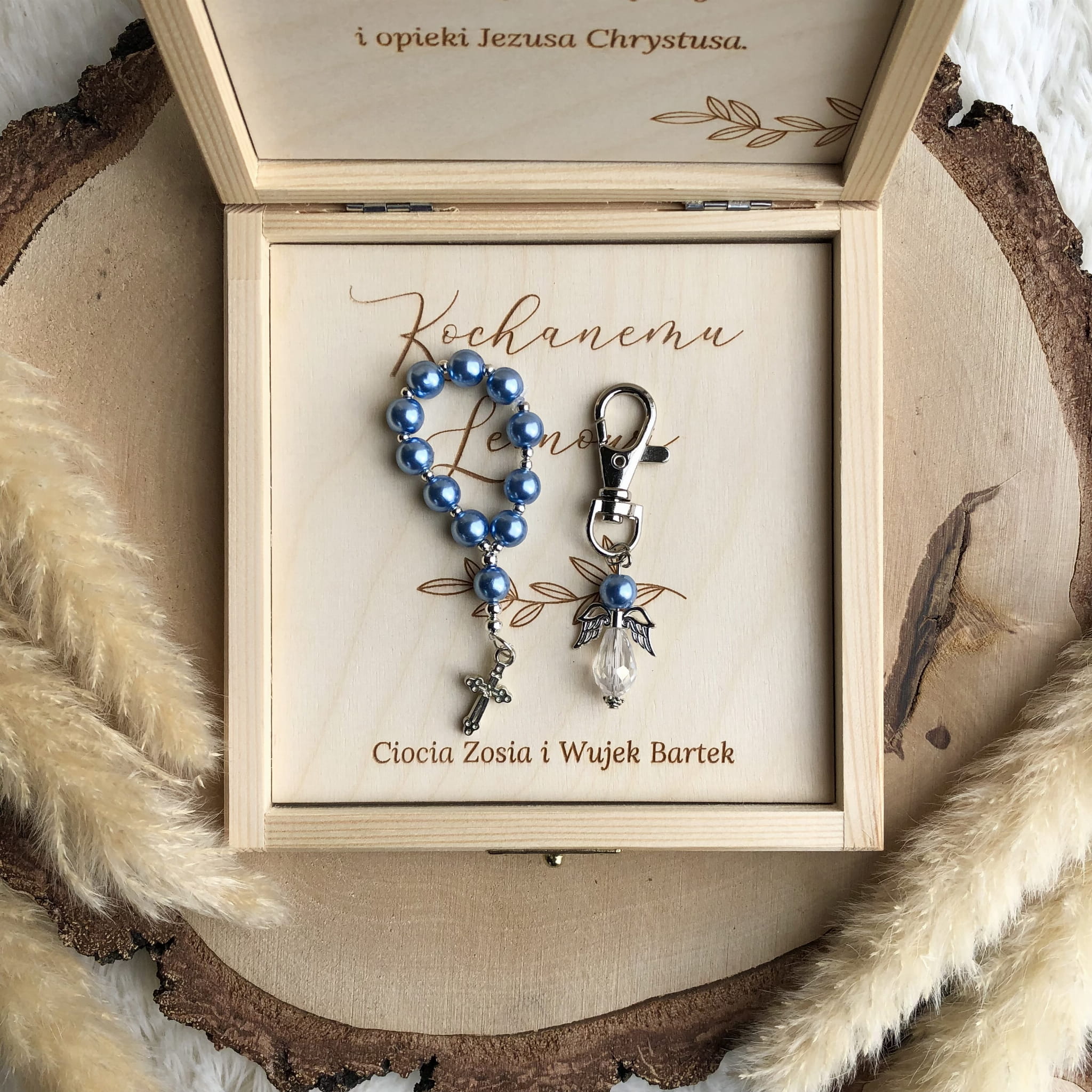 W pudełku znajduje się dziesiątka różańca i breloczek Aniołek. Koralik w breloczku jest dopasowany do wybranego koloru dziesiątki różańca.