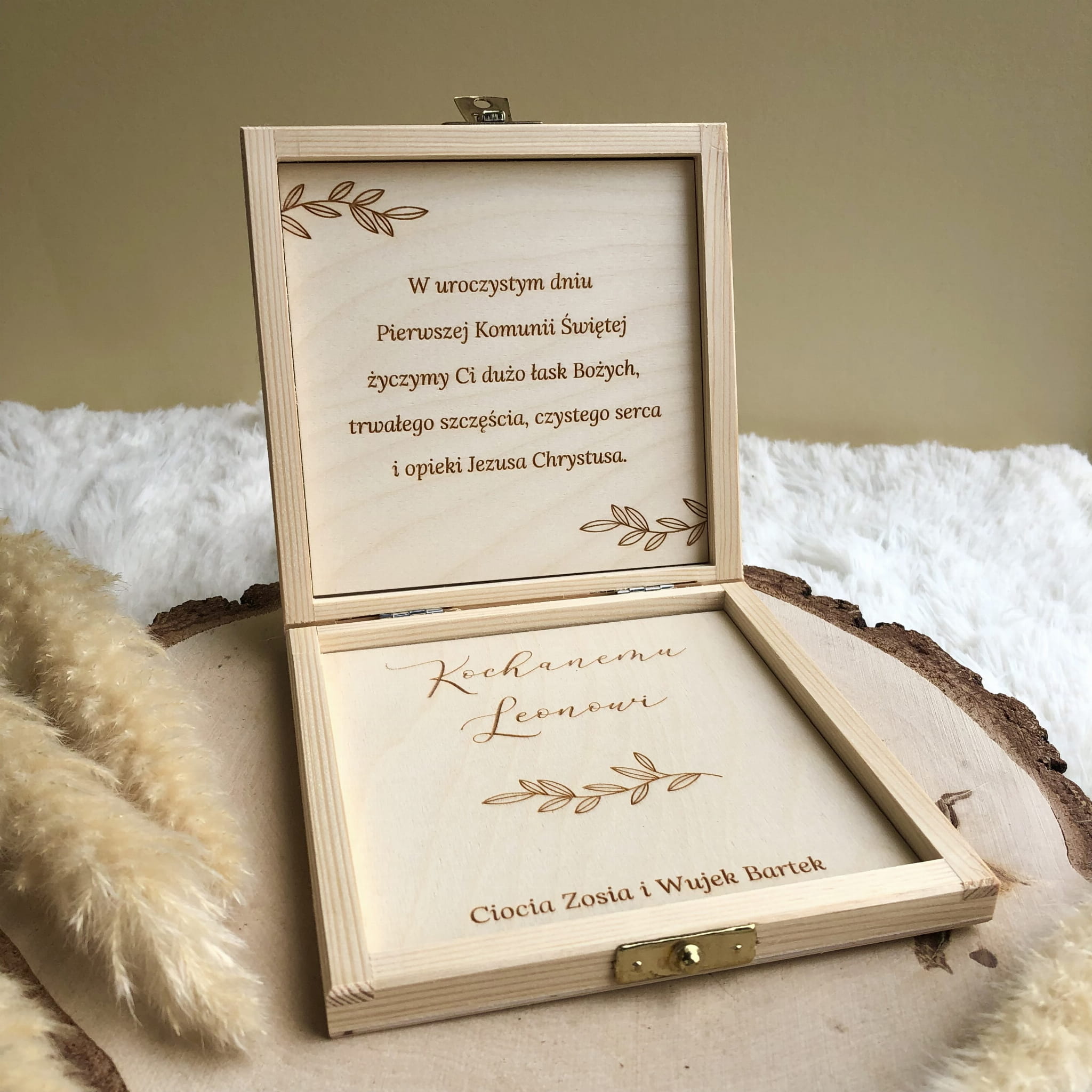 Zamykane, sosnowe pudełko z grawerem z zewnątrz i życzeniami wewnątrz to idealny pomysł na prezent.