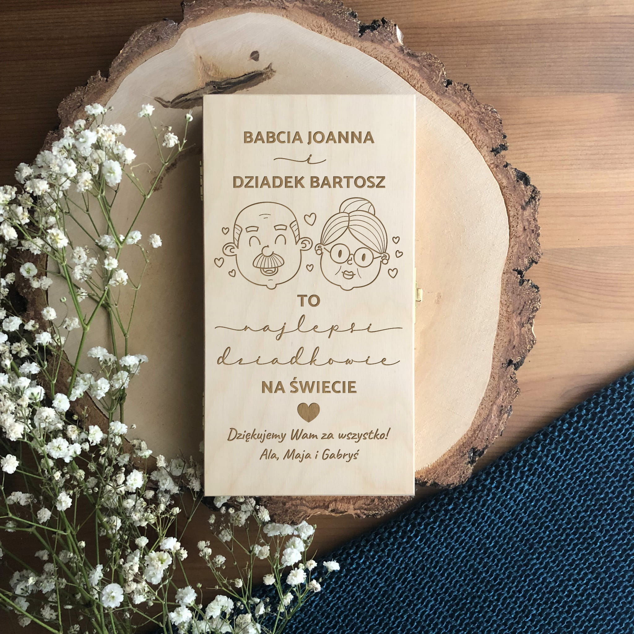Drewniane pudełko na czekoladę z grawerem to pomysł niebanalny, który wyróżni się na tle innych, zaskoczy, wywoła uśmiech i będzie piękną pamiątką dla Babci i Dziadka.