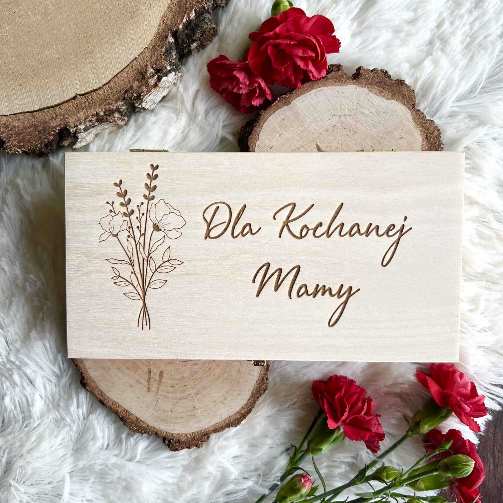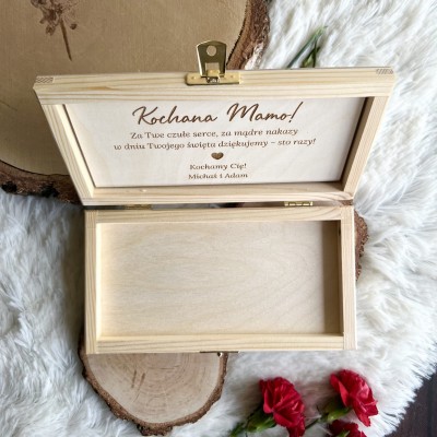 Zamykane, sosnowe pudełko z grawerem z zewnątrz i życzeniami wewnątrz to idealny pomysł na prezent dla Mamy.