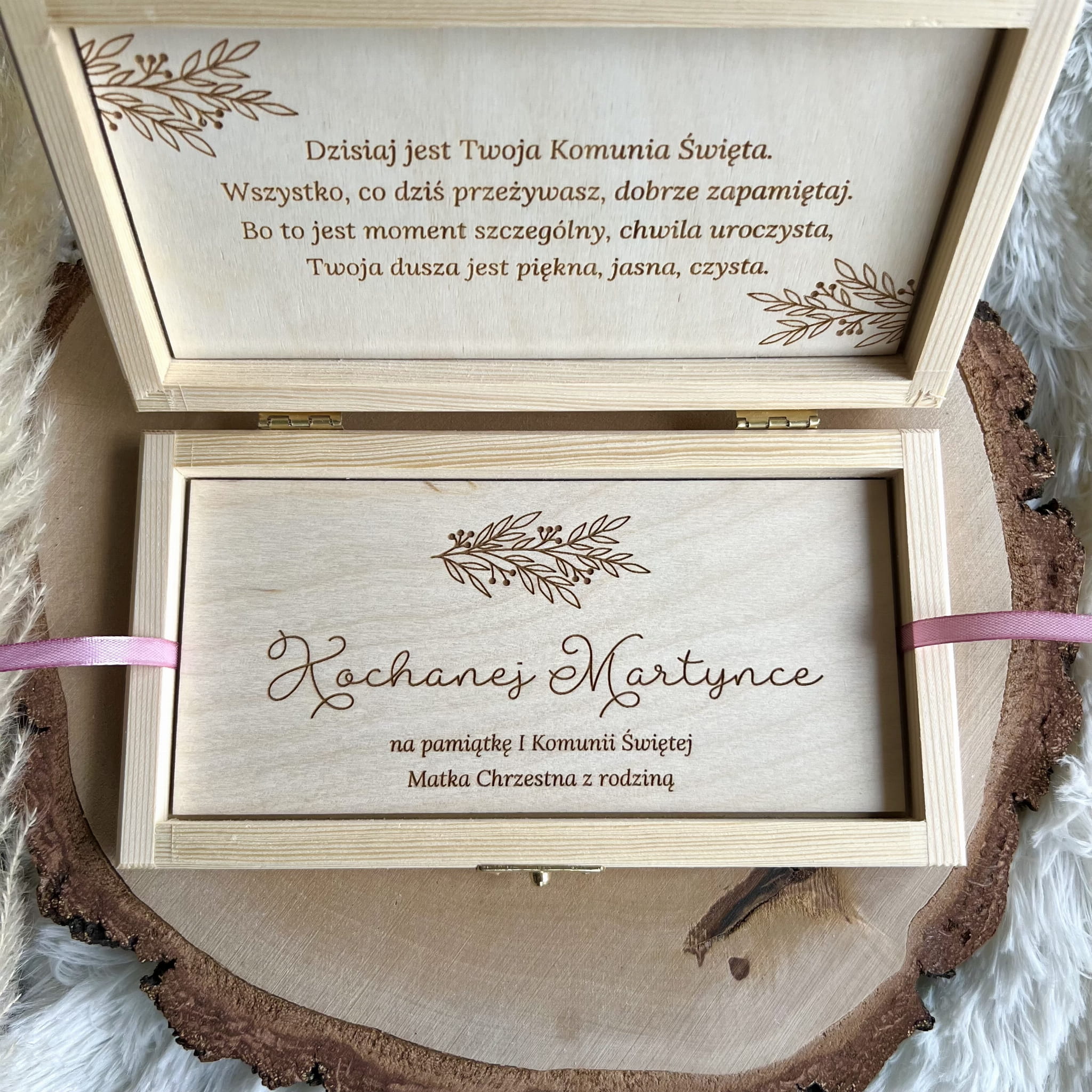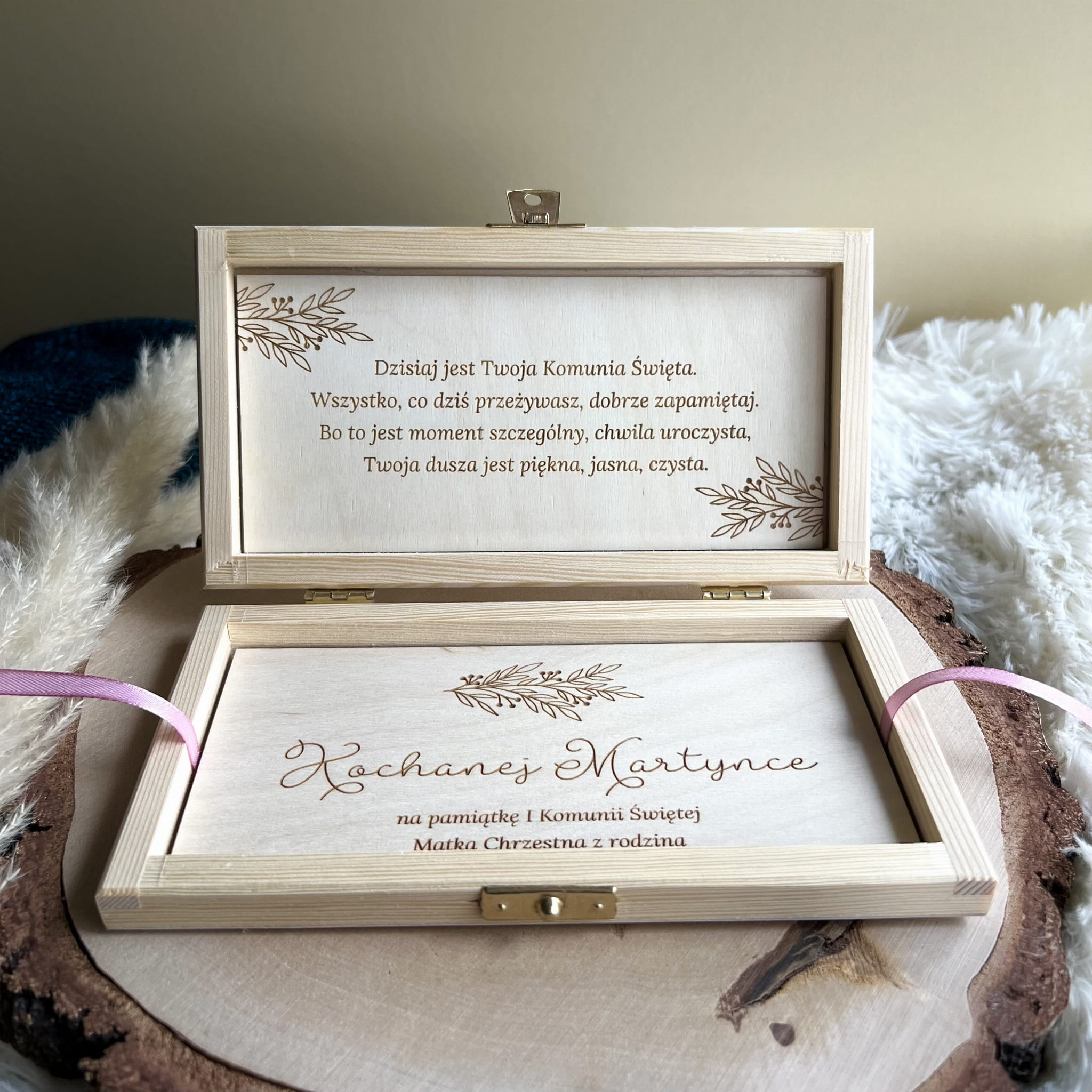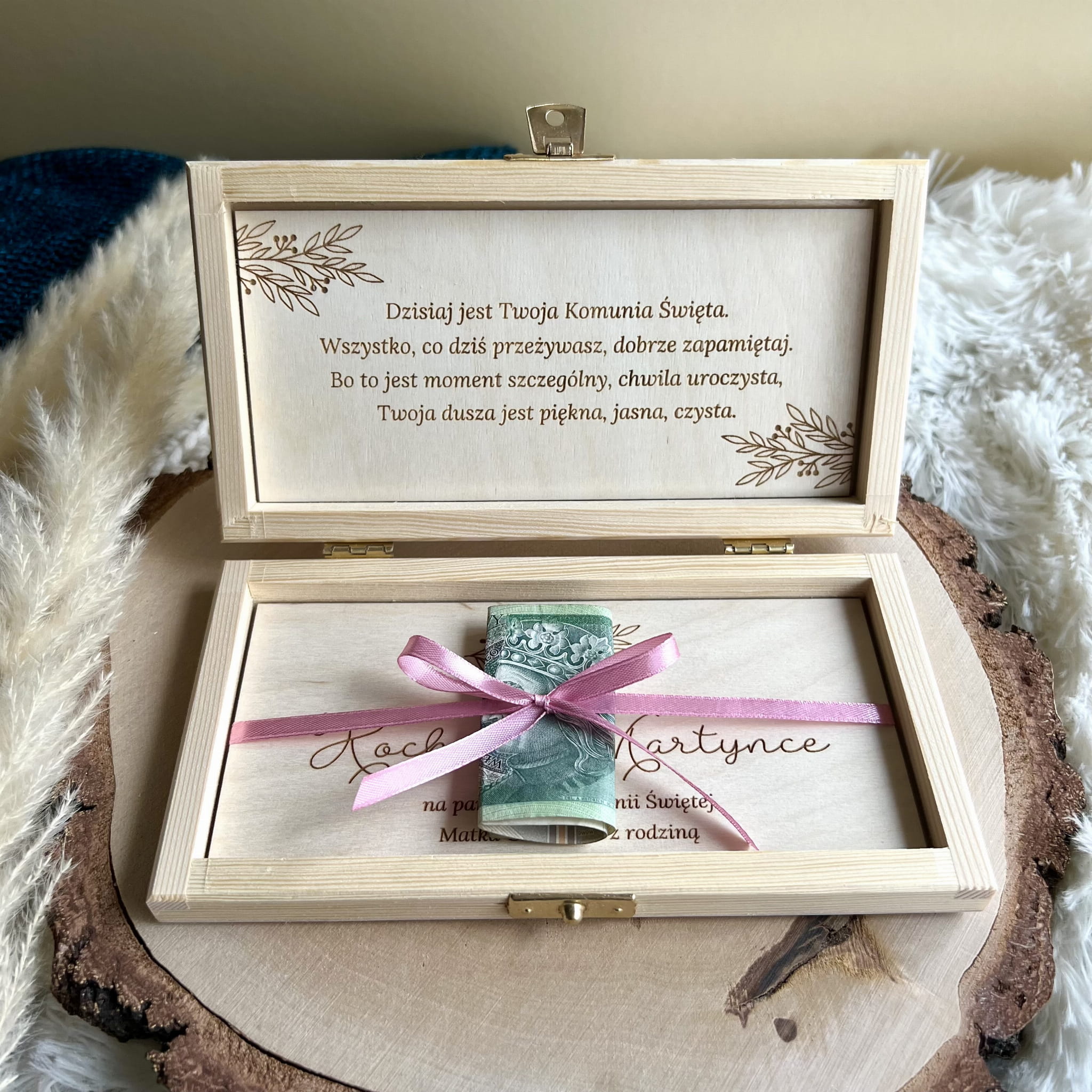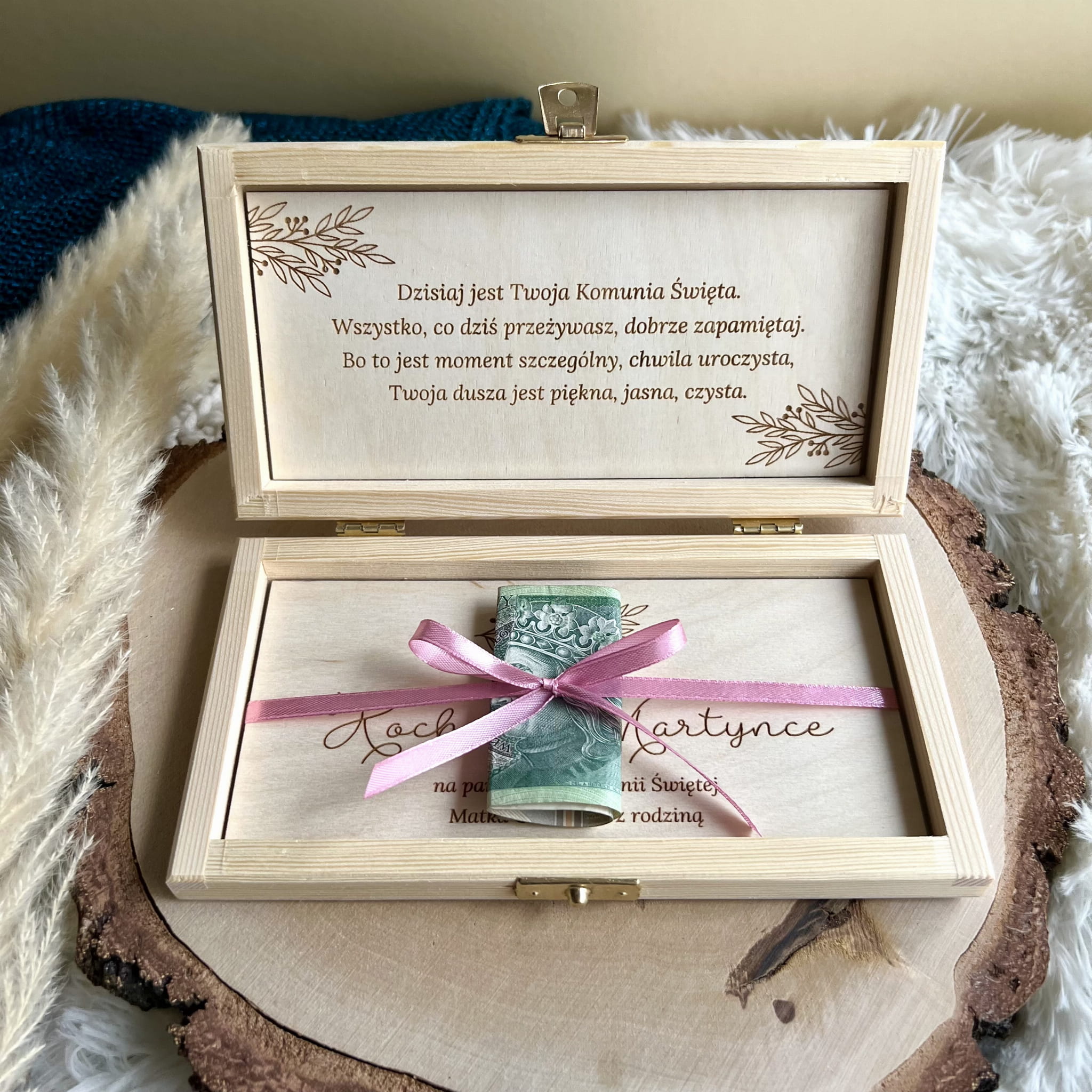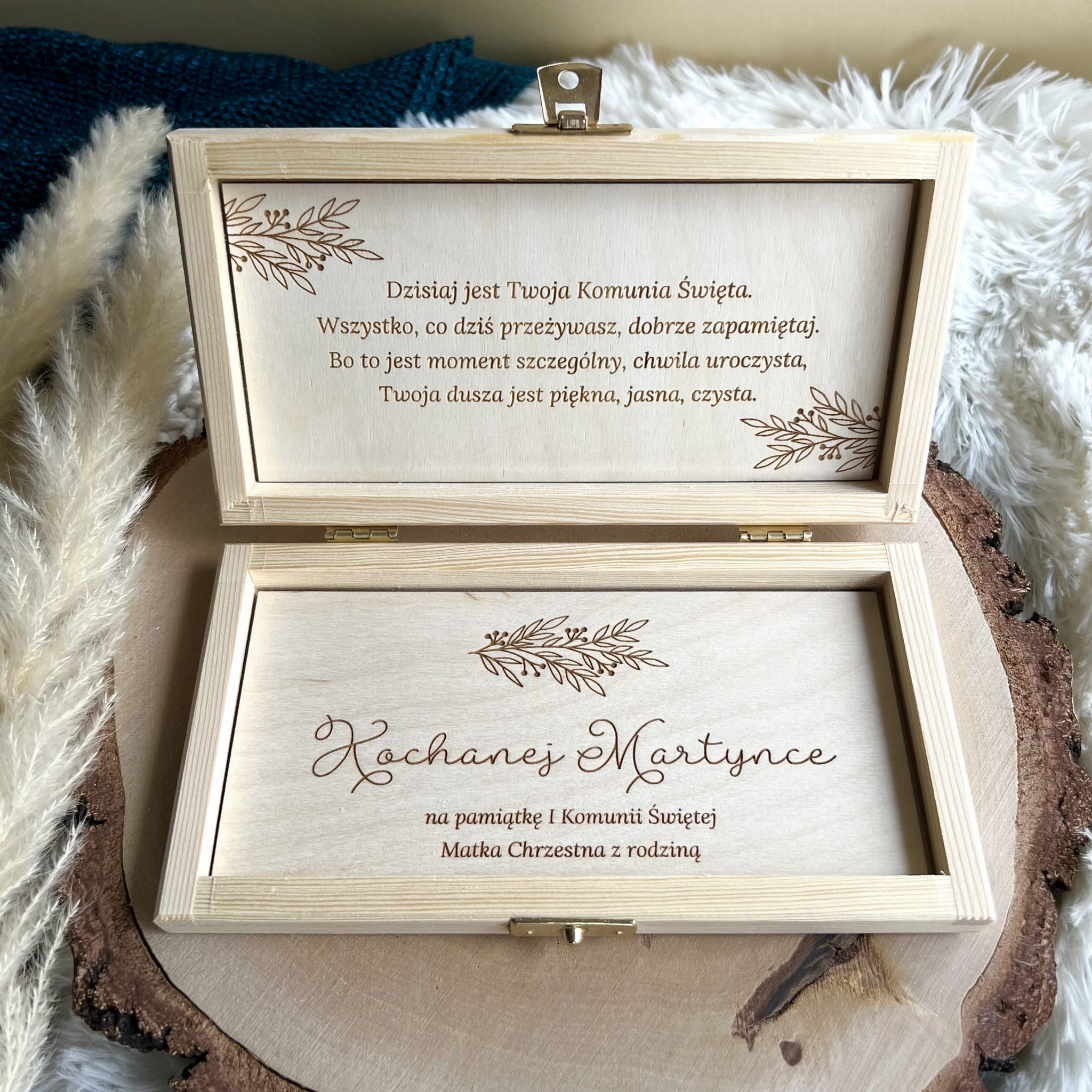 Zamykane, sosnowe pudełko z grawerem z zewnątrz i życzeniami wewnątrz to idealny pomysł na prezent.