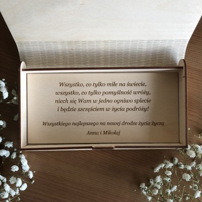Życzenia wygrawerowane są na sklejce drewnianej i wklejone do pudełka.