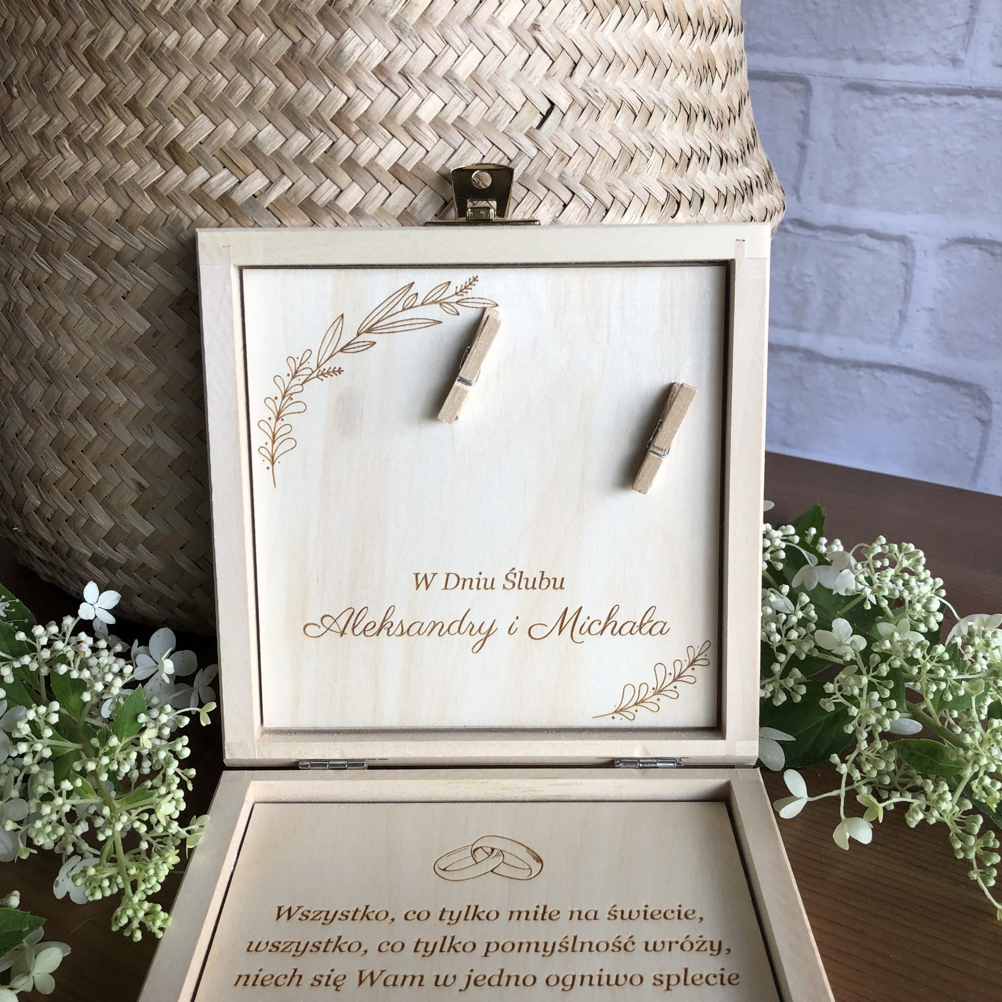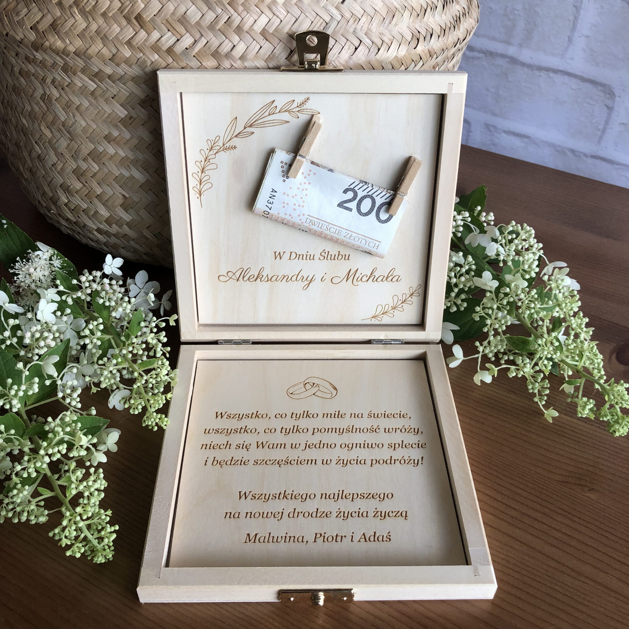 Zamykane, sosnowe pudełko z grawerem z zewnątrz i życzeniami wewnątrz to idealny pomysł na prezent ślubny.