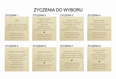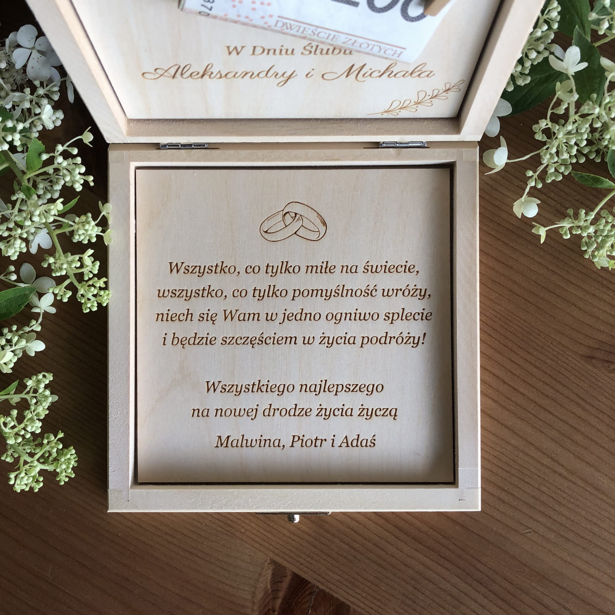 Życzenia wygrawerowane są na sklejce drewnianej i wklejone do pudełka.